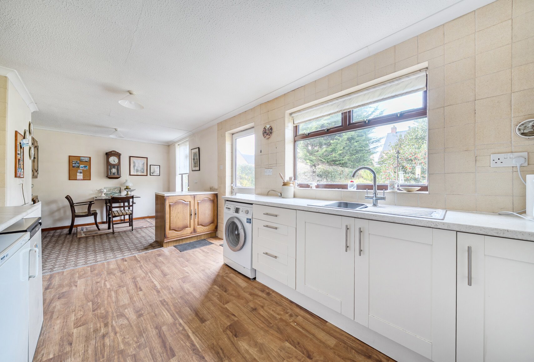 From the sitting room/dining room, a door leads into the kitchen/breakfast room, which was added to the property some years ago. The kitchen is fitted with a range of wall and base units and offers space for freestanding appliances. An internal door provides direct access to the garage, which benefits from power, lighting, and a useful tool store.