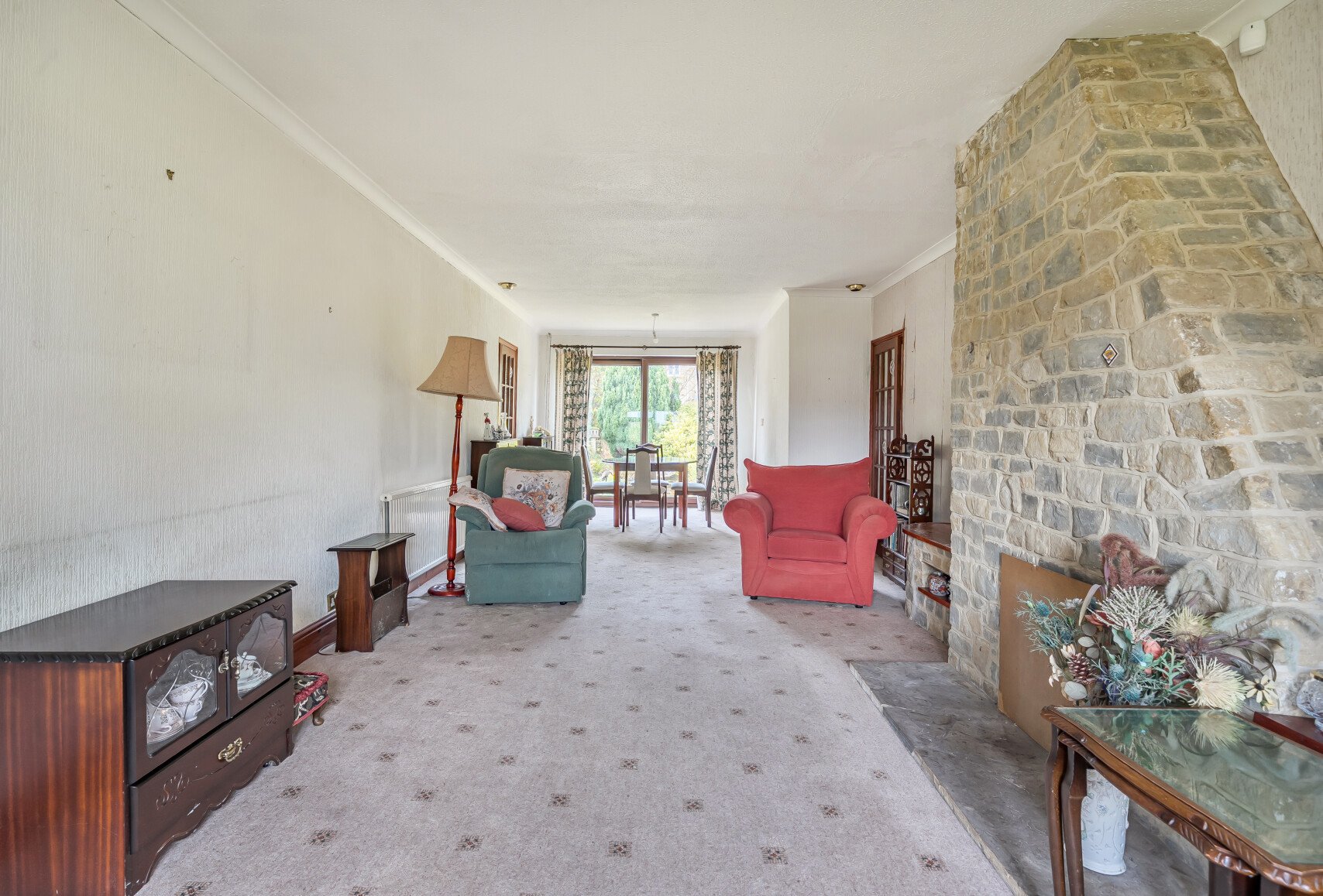 Inside, the hallway provides access to all three bedrooms and the family bathroom. The lengthy 30' sitting room/dining room is of a dual aspect featuring a charming stone-built fireplace with surround and hearth, creating a welcoming focal point.