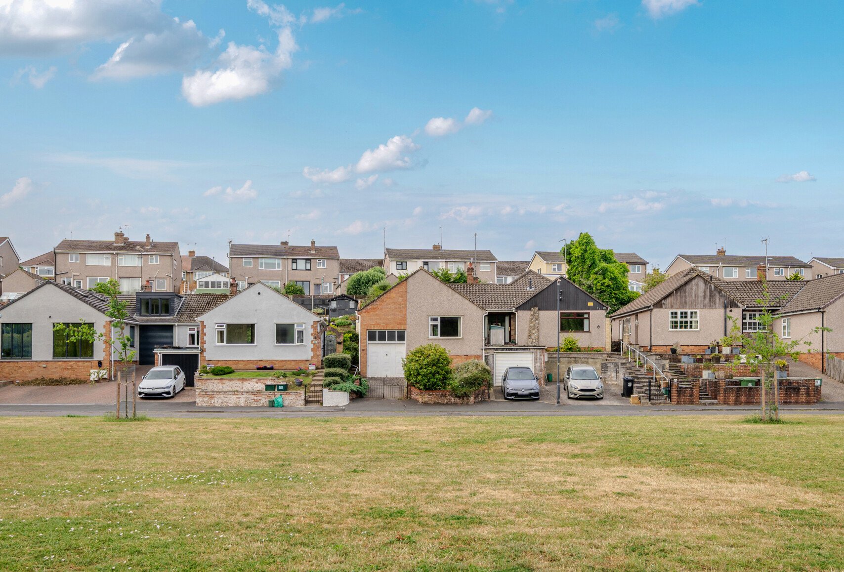 There is a sloped driveway to the front, and garden over mulitple levels to the rear with storage shed and green house.