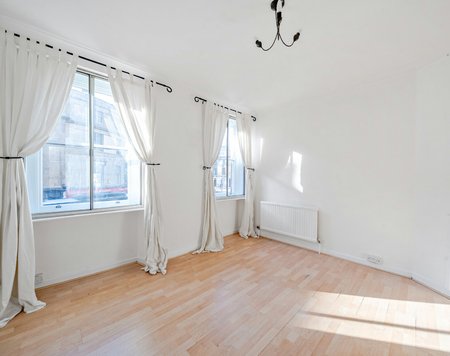 The spacious sitting room is filled with natural light from two Georgian sash windows, all fitted with secondary glazing. A fireplace in the corner provides a nice focal point, adding warmth and charm to this elegant living space.