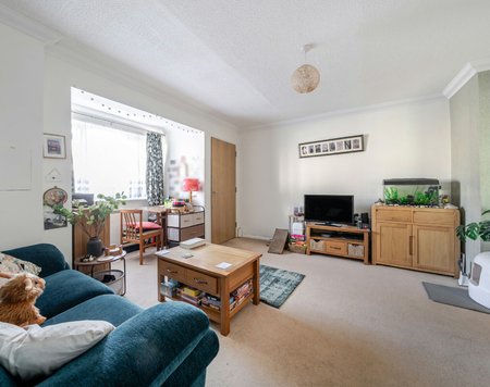 Accessed via its own private front door and enclosed porch, the accommodation comprises a generously proportioned reception room with ample space for dining or a work-from-home area. The room is flooded with natural light from a large bay window, creating a bright and welcoming living space.
