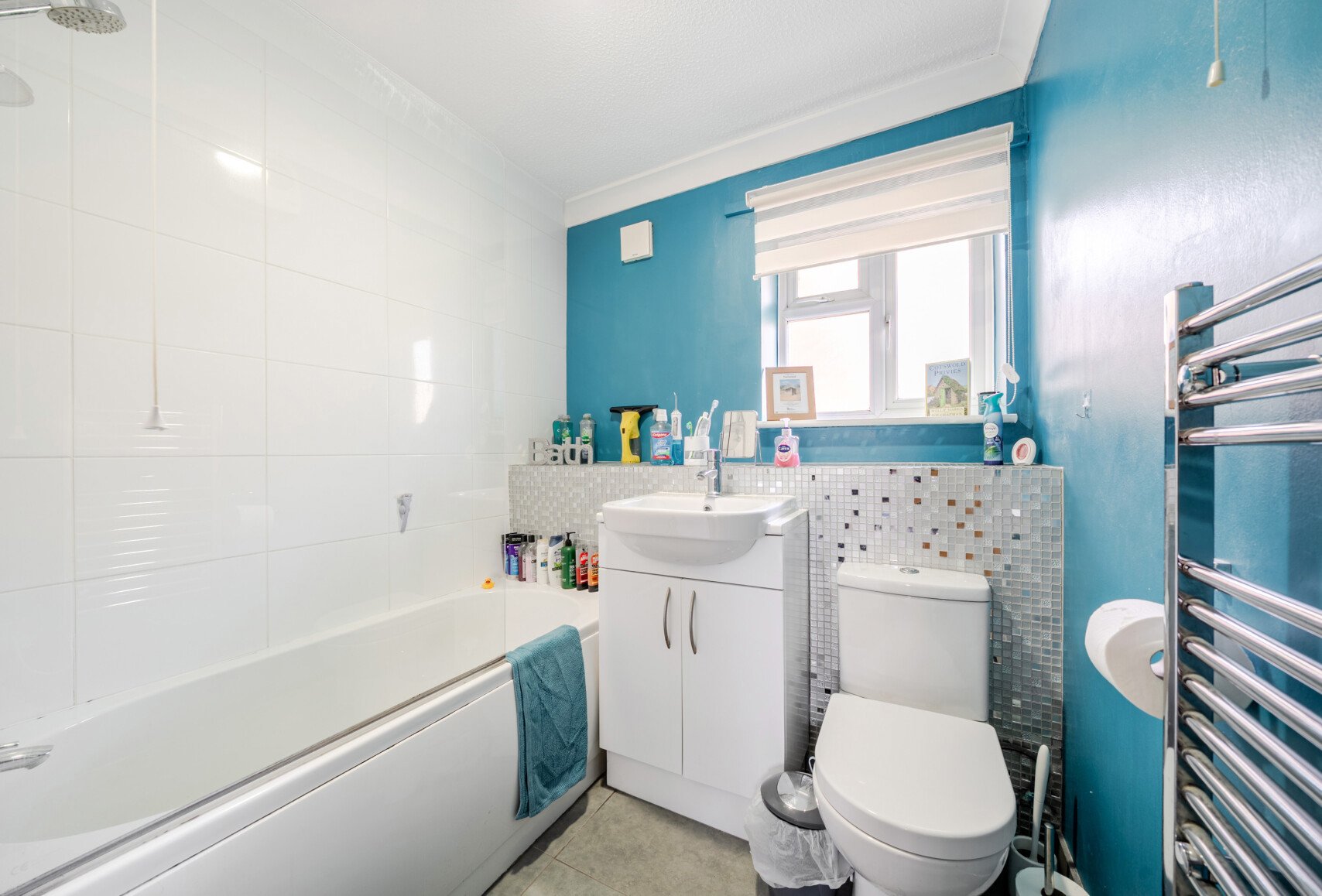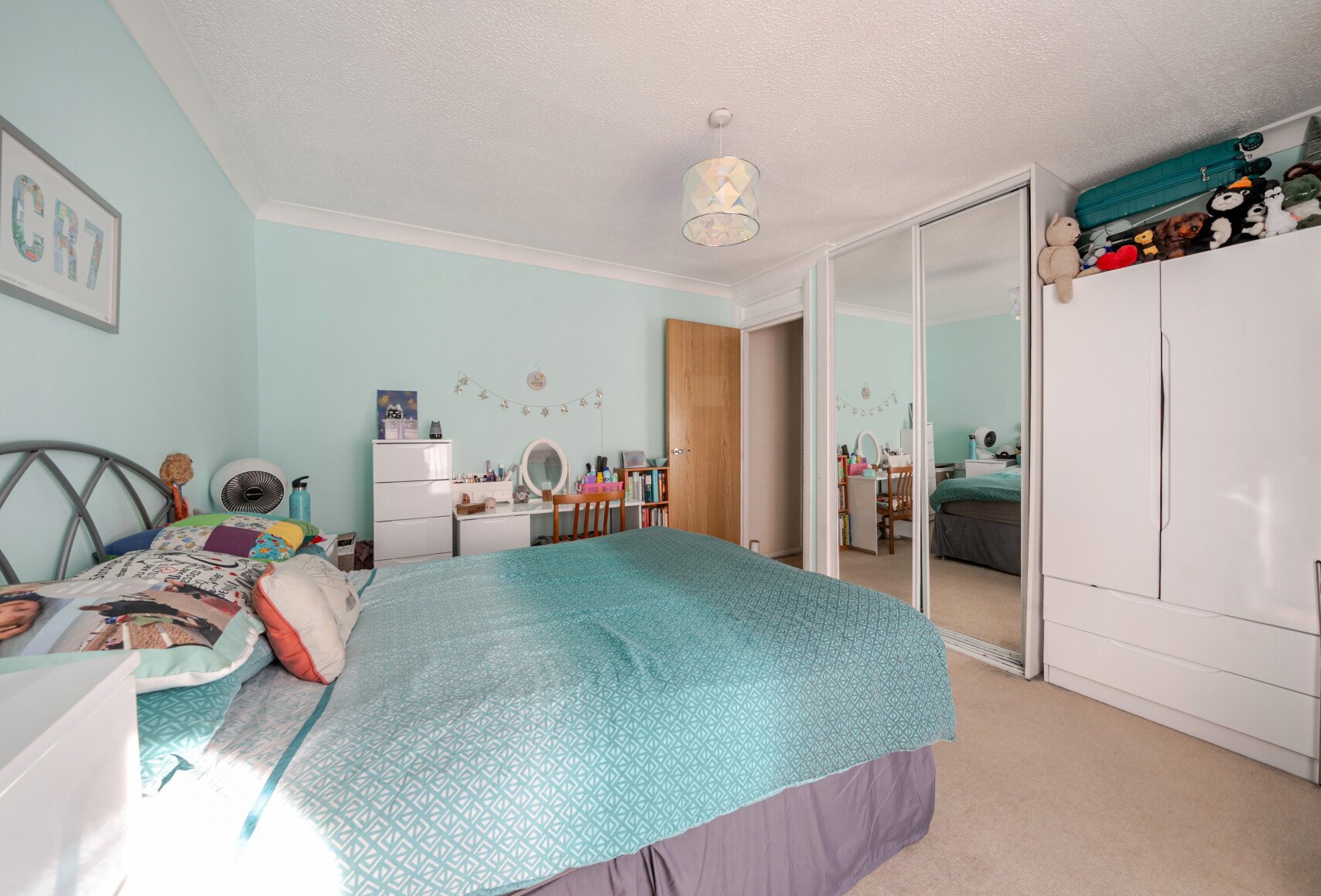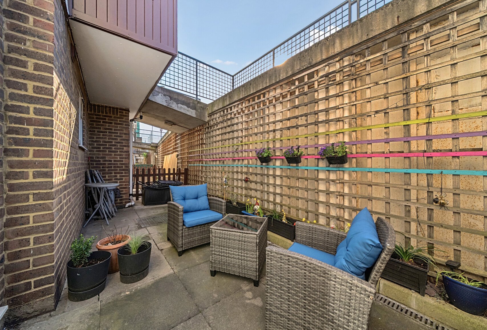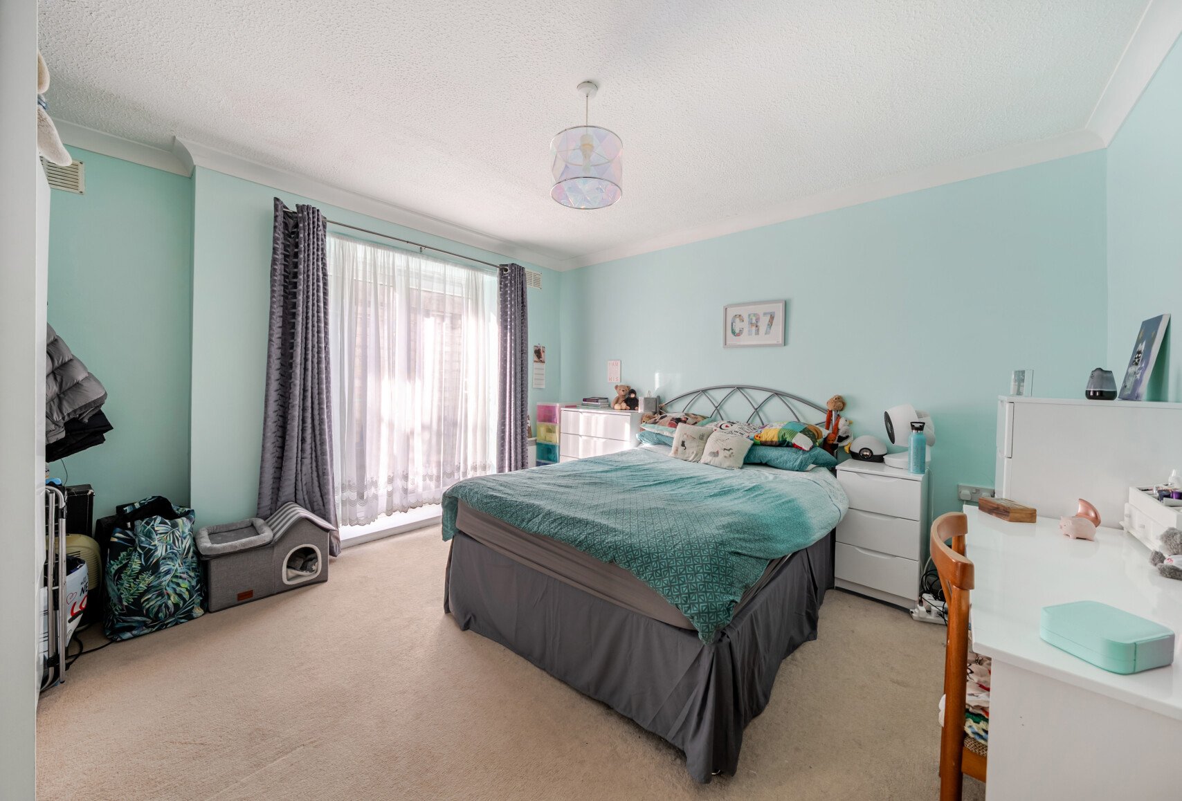 To the rear of the property is a three-piece bathroom, along with a spacious double bedroom with built-in wardrobes. Sliding doors open directly onto a paved private rear garden, providing a pleasant outdoor space.