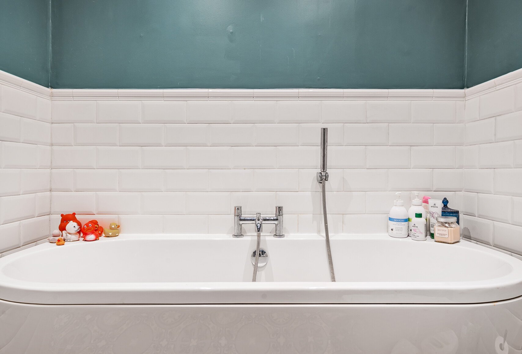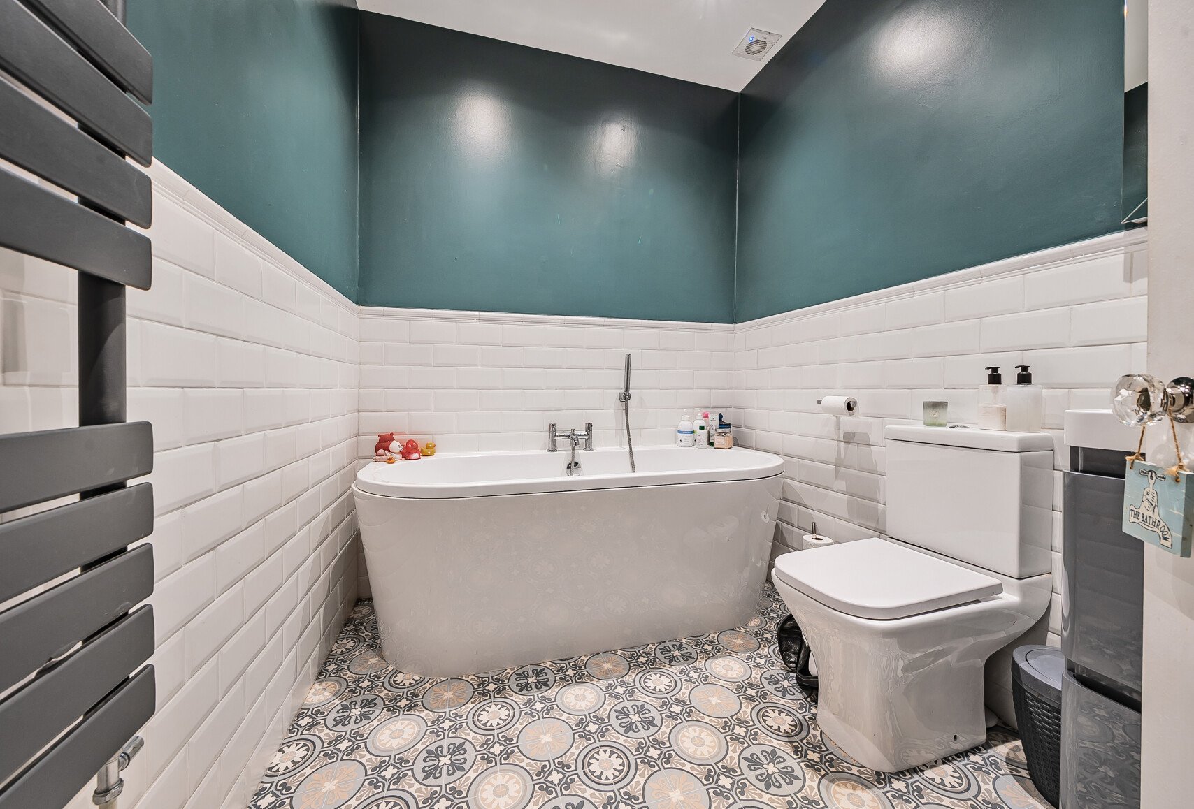 Both bedrooms are generous doubles. Bedroom one measures 13ft 1" by 8ft 11" and benefits from an en-suite shower room. Bedroom two, located at the rear of the flat, offers flexibility and could alternatively be used as a dining room, snug, or additional living space. From this room, you can access a private walled courtyard, the perfect spot for a morning coffee or evening drink. The main bathroom, situated off the hallway, is a stylish three-piece suite featuring a freestanding bath. Additionally, there is ample built-in storage throughout the apartment.