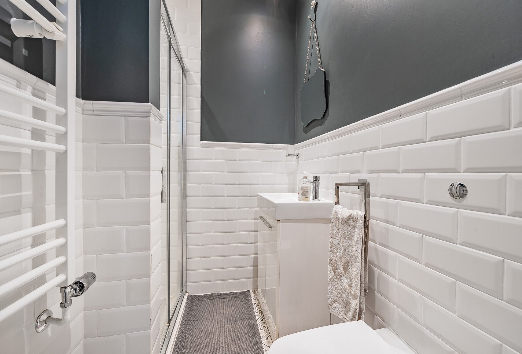 Beautifully presented throughout, the property welcomes you with a spacious open-plan living and dining room. Two elegant sash windows at the front overlook the private entrance, filling the space with natural light. A striking feature fireplace, framed by two alcoves, adds to the room’s period charm. The modern kitchen is fitted with sleek grey base and wall units, complemented by marble-effect worktops. It also boasts a range of integrated appliances, including a dishwasher, oven, fridge, and freezer. To the rear of the room, a built-in cupboard cleverly accommodates a study space.