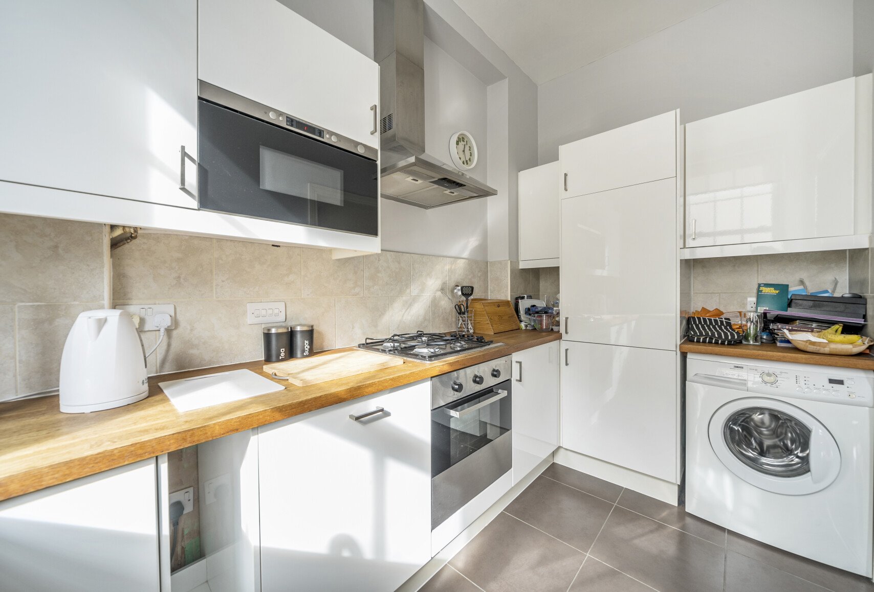 Set within a well-maintained, purpose-built development, this charming apartment offers a thoughtfully arranged layout. The entrance hall includes a convenient storage cupboard, leading to a white two-piece bathroom featuring a WC, wash hand basin, and bathtub with overhead shower. The spacious primary double bedroom benefits from built-in storage and elegant double sash windows that allow natural light to pour in, while the second bedroom sits adjacent. At the rear of the property, a dual-aspect living/dining room with tall ceilings creates a bright and airy atmosphere. Just off this space, the kitchen is fitted with wall, base, and drawer units, a wash hand basin, built-in fridge/freezer, oven and hob, and space for an additional appliance.