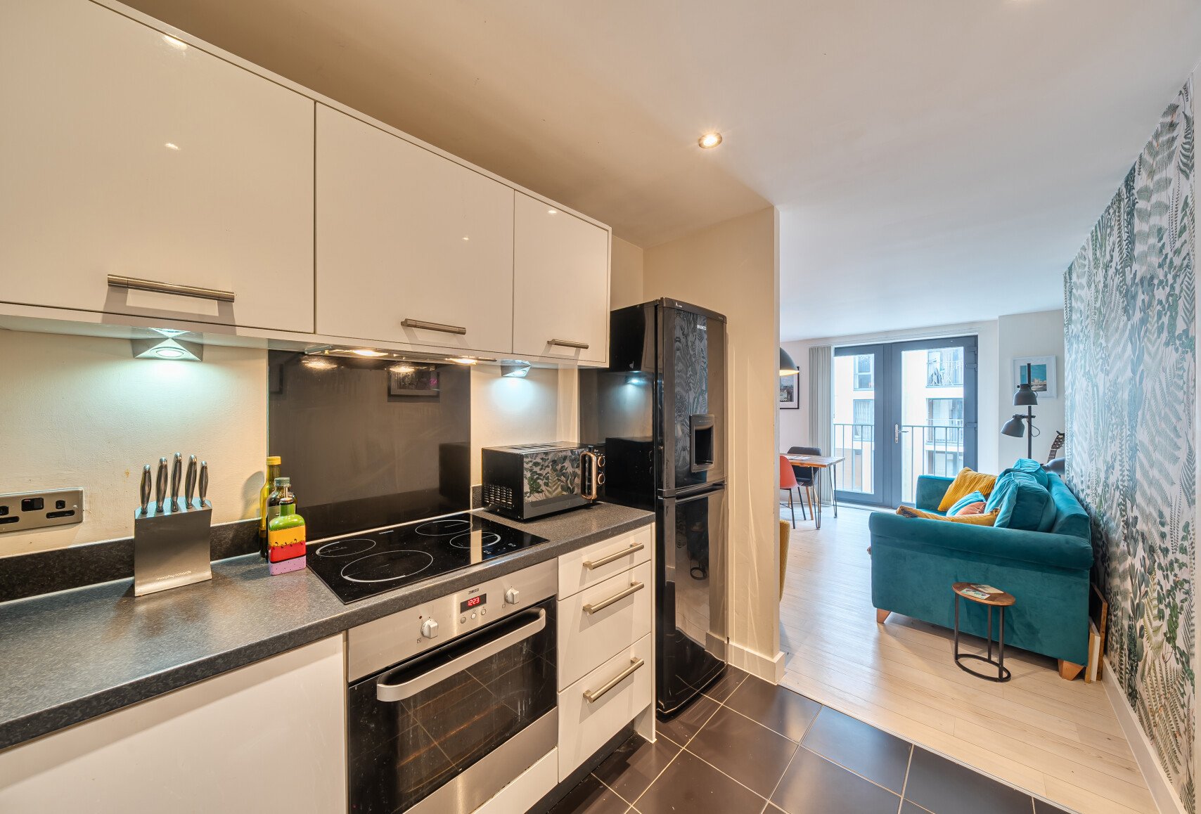 The front door opens onto an inviting hallway which benefits from a storage cupboard and gives access to a good-sized reception room measuring 15'8" x 14'1", roomy enough to accommodate lounging and dining areas and features wood effect laminate flooring as well as a door opening onto a 'Juliet' style balcony. The reception room continues through to the fitted kitchen which supplies ample cupboard storage and comes with an electric hob and oven. There is a sizeable (13'11" max. x 10'10" max) double bedroom and completing this enticing home is a well-designed bathroom.