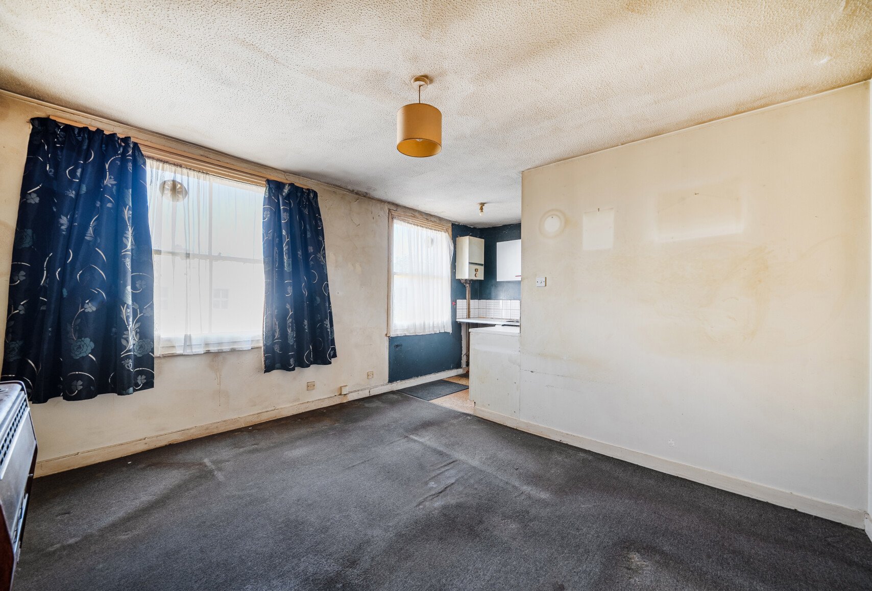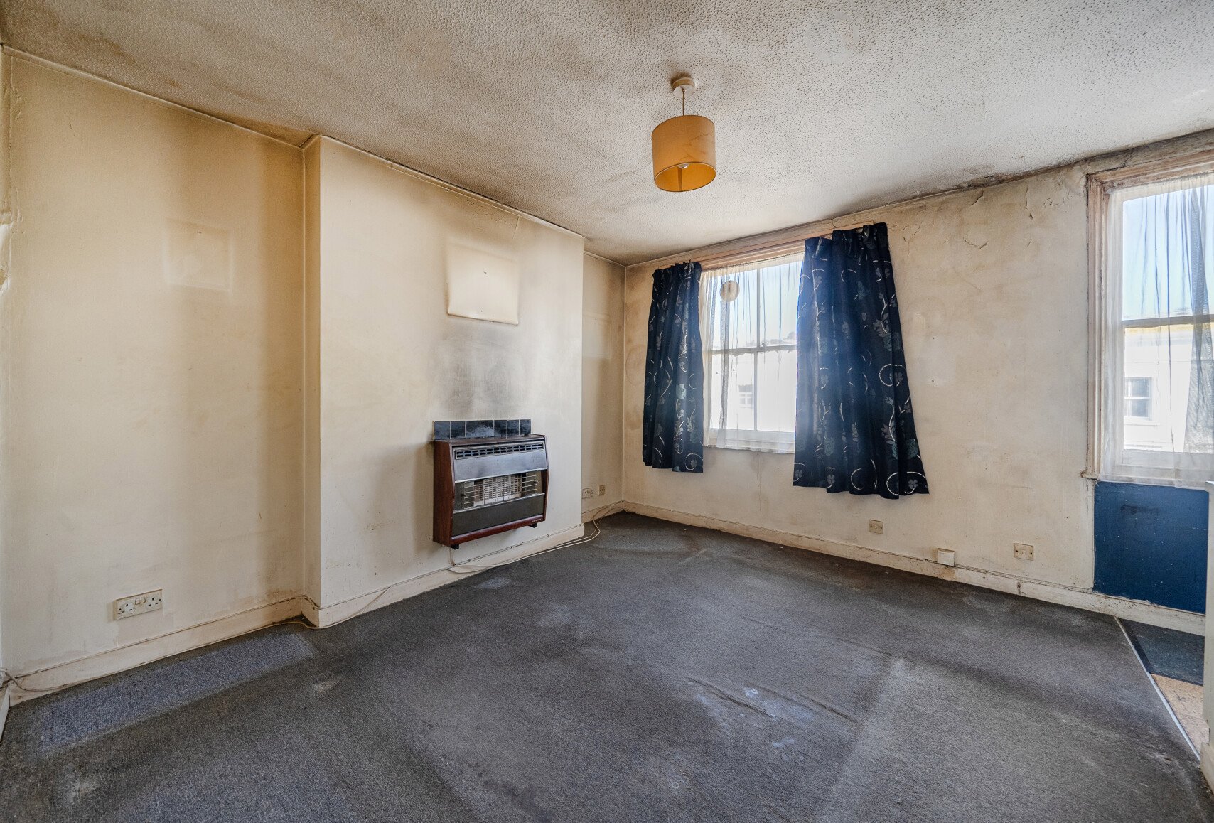 This top-floor flat forms part of a charming period property and offers excellent potential for refurbishment throughout. At the front, a bright and airy kitchen/sitting room benefits from plenty of natural light, while to the rear is a well-proportioned double bedroom.