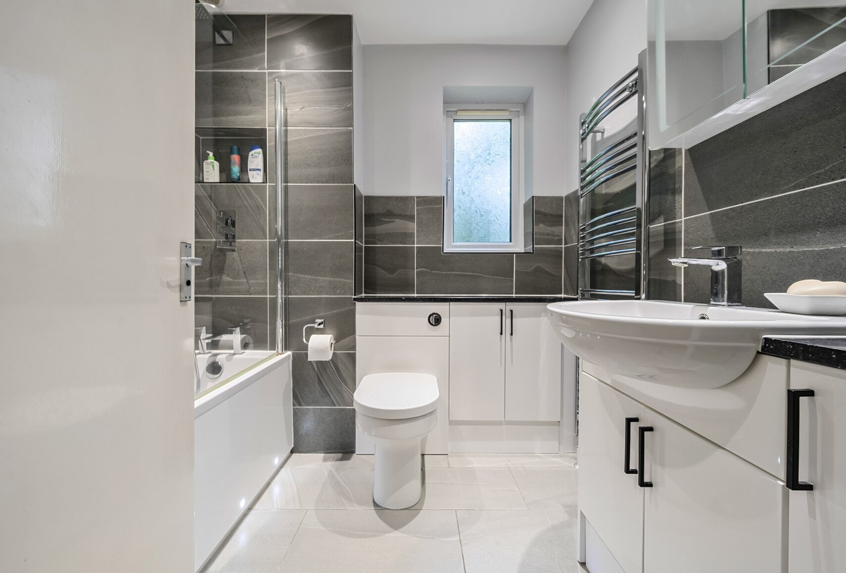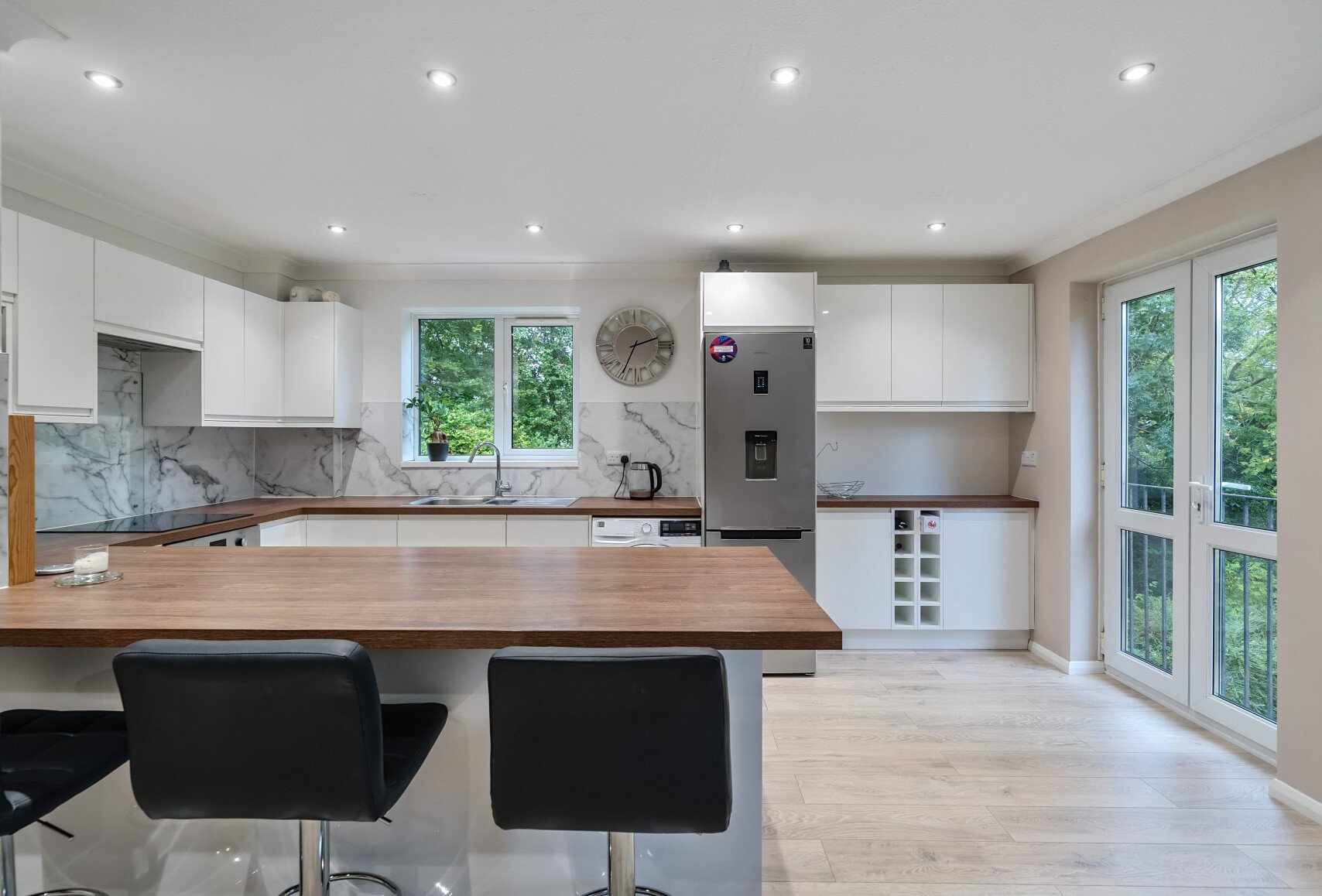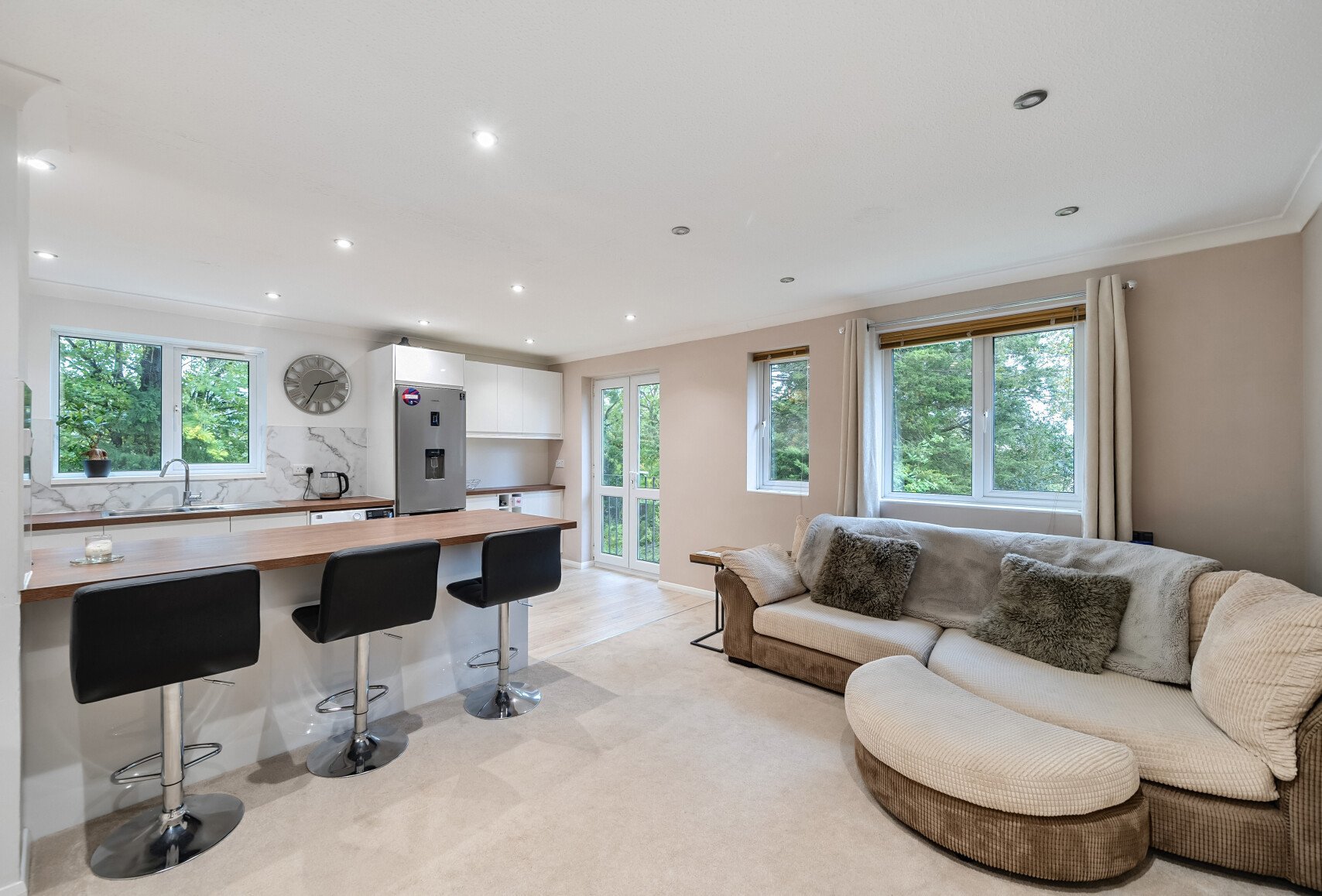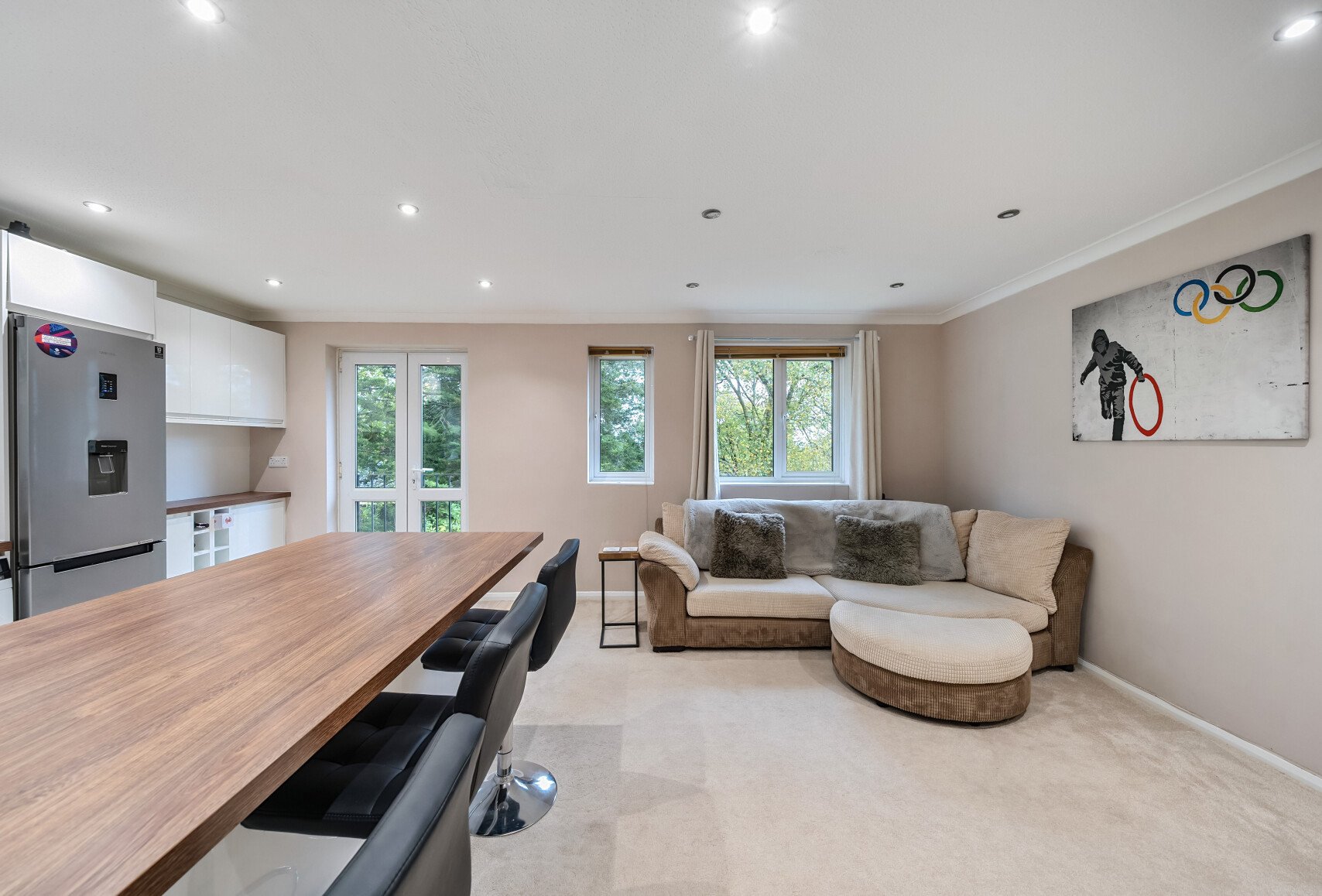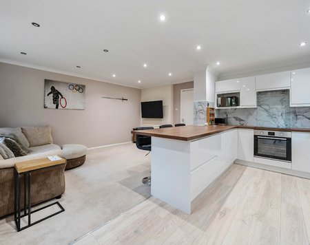 A communal door leads to stairs to the first floor and the front door to this stylish flat, on entering to the right is an open plan sitting, dining and kitchen with large windows looking over the gardens towards Bath City. The kitchen has a Juliette balcony and a range of modern units including an induction hob, oven and integrated dishwasher. Another window looks to the side of the building and gives extra light into this bright space. A breakfast bar and sitting area completes this spacious room. The family bathroom has a bath with shower above, a basin and a WC it is very well presented. Two double bedrooms, double glazing and gas central heating complete this desirable property.