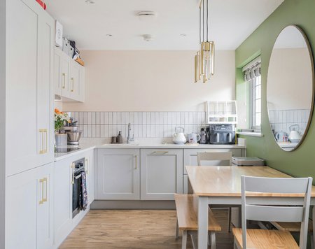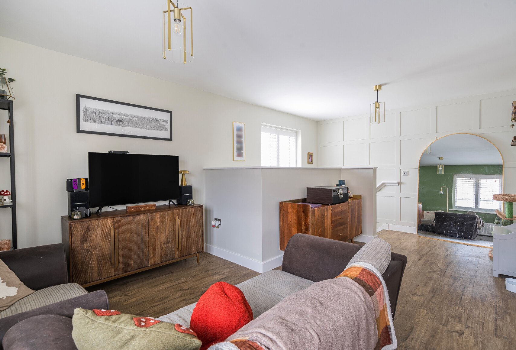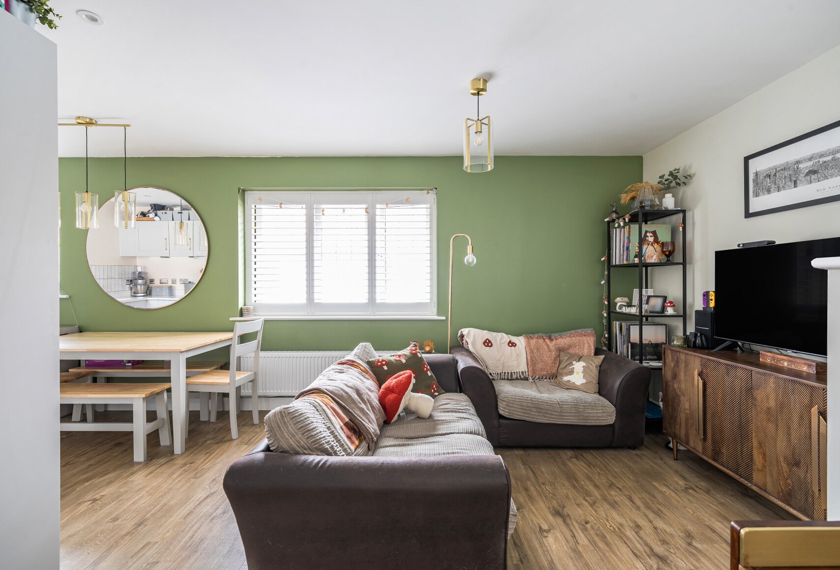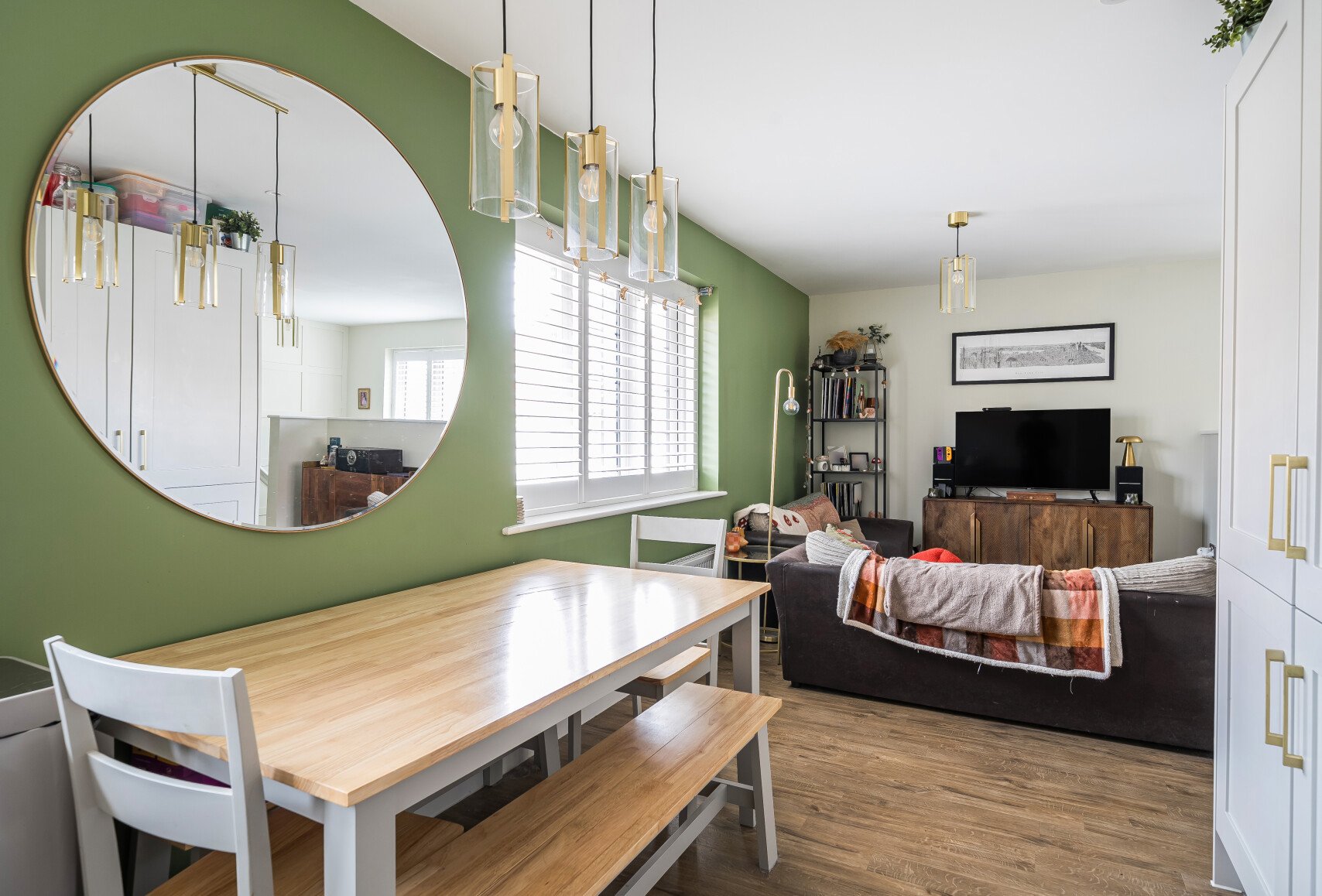 Upstairs you are welcomed into an open plan living space with a sitting area, dining area and kitchen. The interior design is exceptional with a feature panelled wall, brass light fittings and kitchen handles and marbles work surfaces in the kitchen.