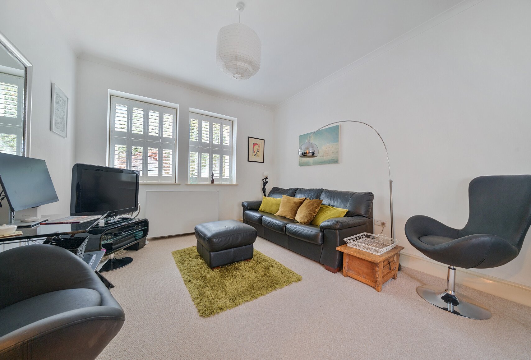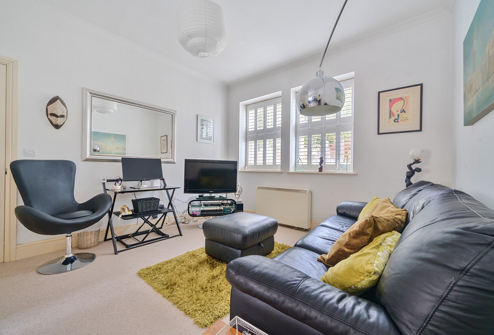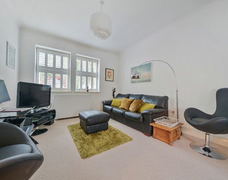 The generous reception room, measuring 19'10" x 11'8", provides ample space for both a comfortable seating area and a dining setup. There is also a useful study area, ideal for home working. The L-shaped layout leads seamlessly into the kitchen, which is fitted with modern white base and wall units, providing plenty of storage. Integrated appliances include a fridge, freezer and oven. This whole space feels light and bright, thanks to its dual-aspect orientation, with windows fitted with attractive shutters in keeping with the period style of the property.