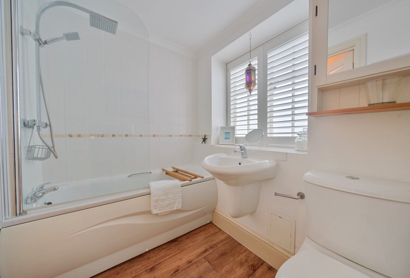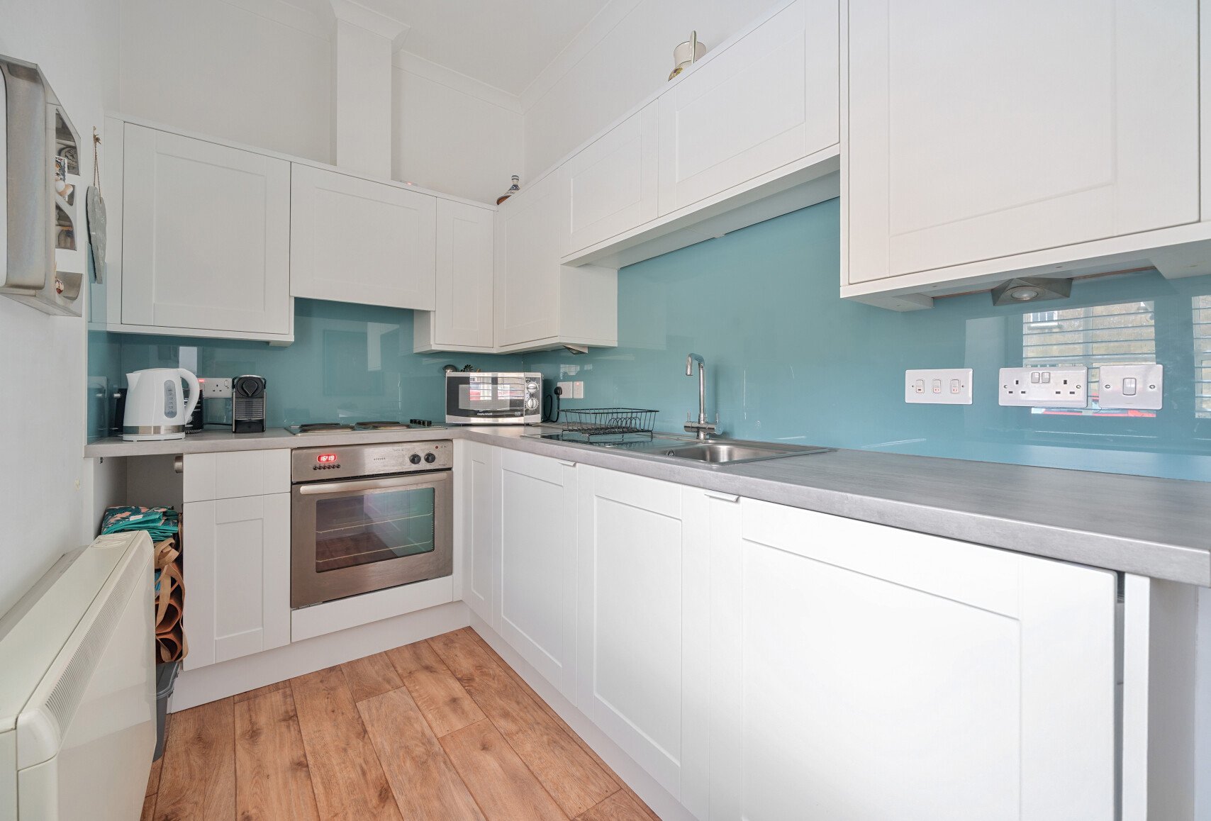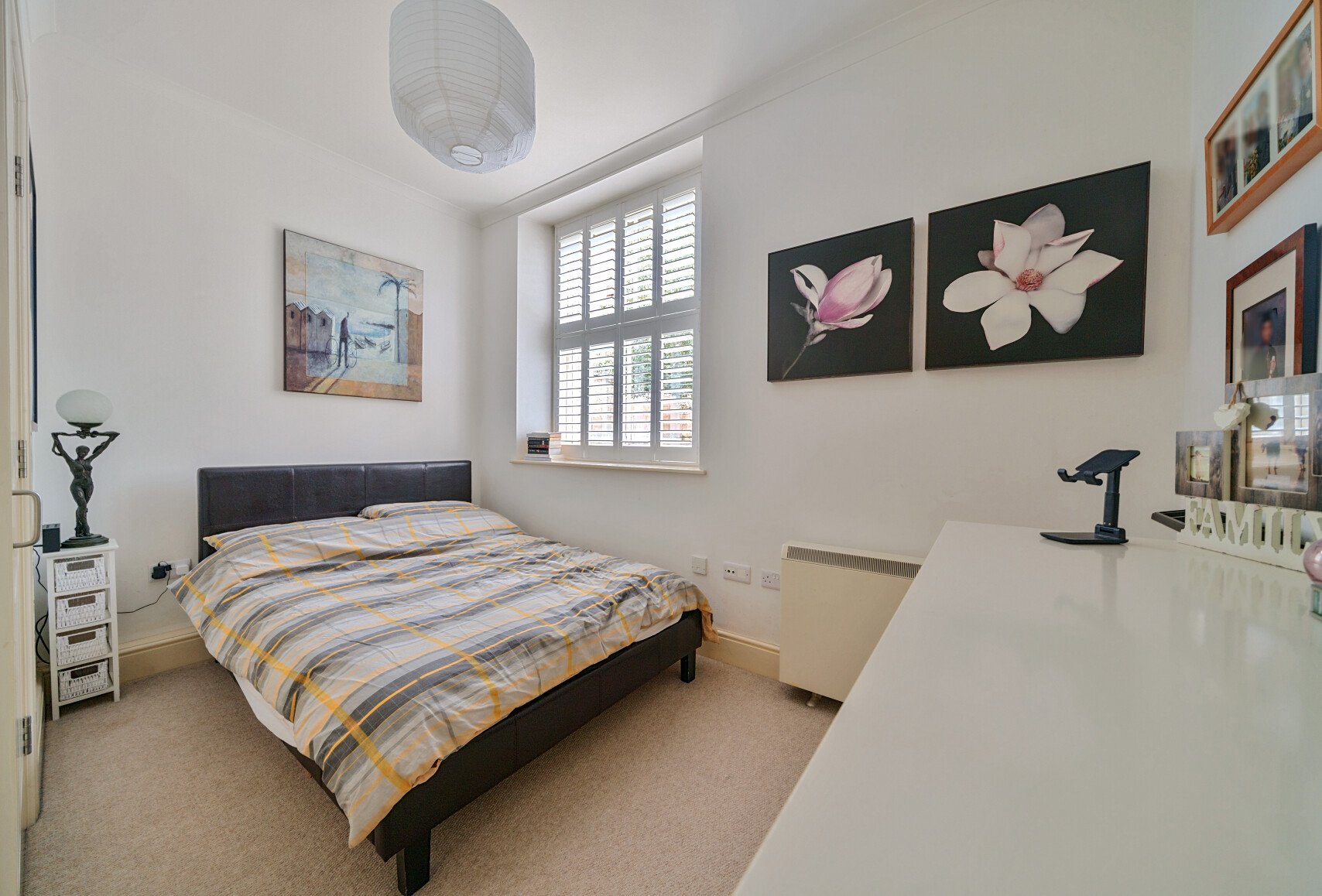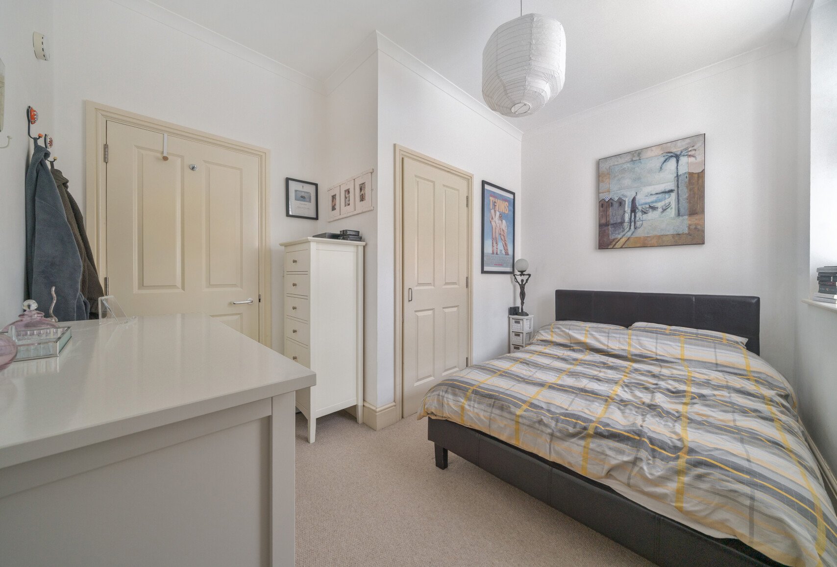 The double bedroom, measuring 12'3" x 9'8", includes builtin storage, removing the need for a freestanding wardrobe. The accommodation is completed by a bathroom with a shower over bath and a heated towel rail. A handy hallway storage cupboard provides additional convenience.