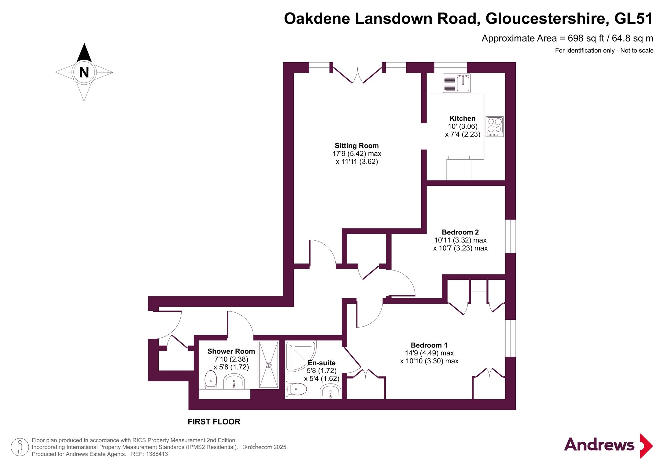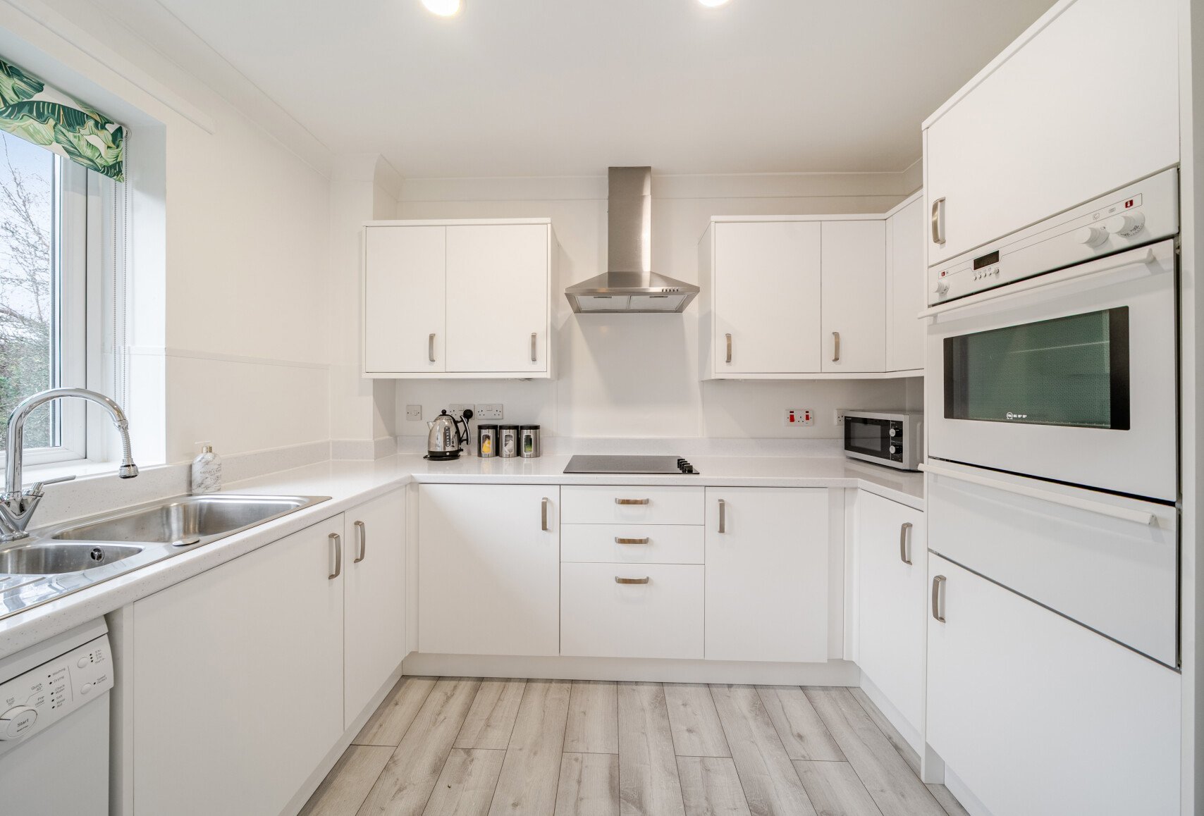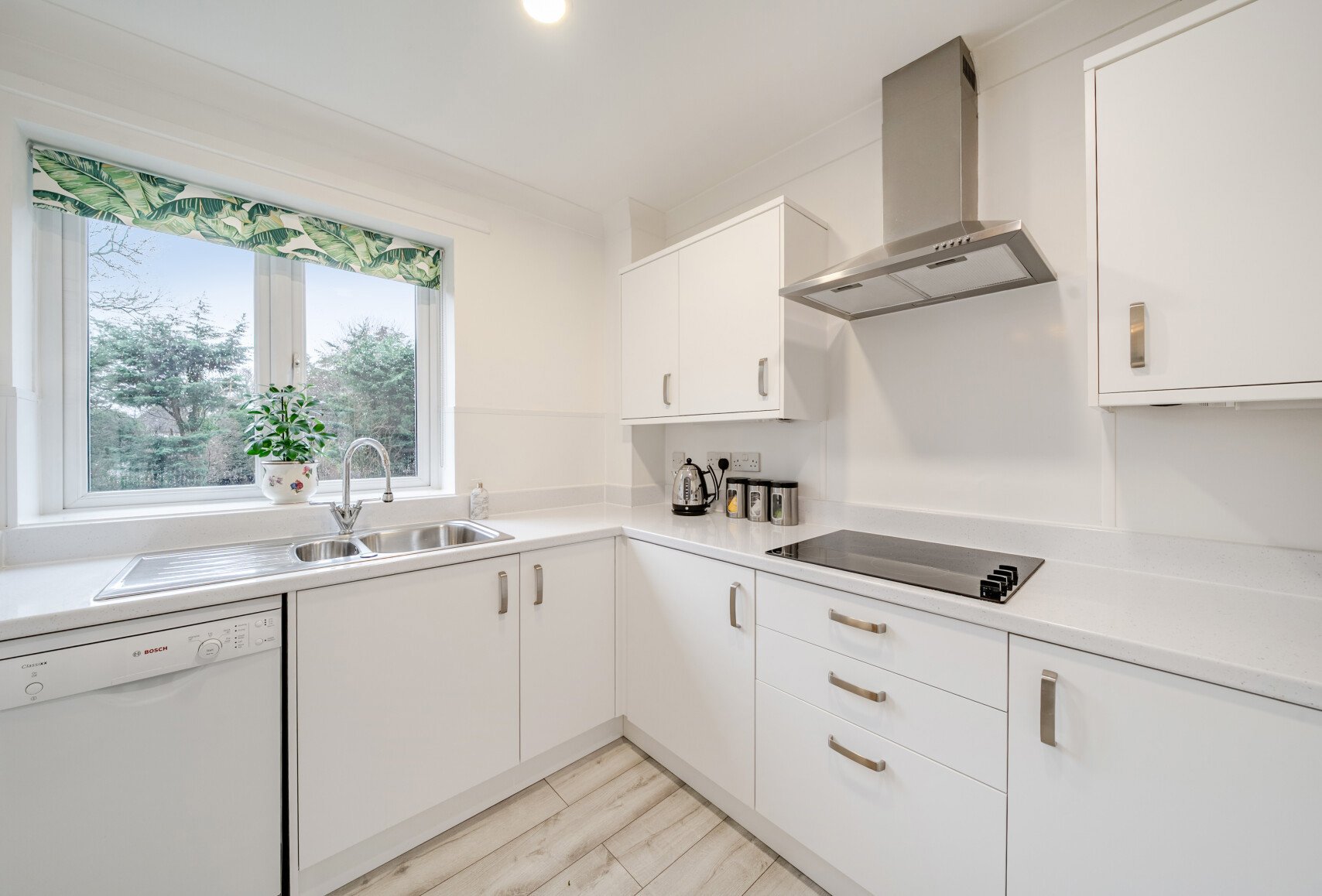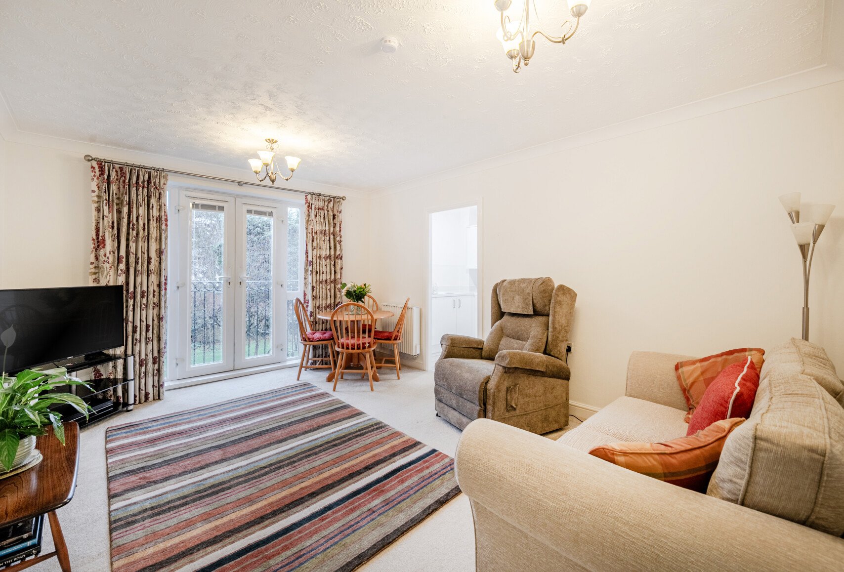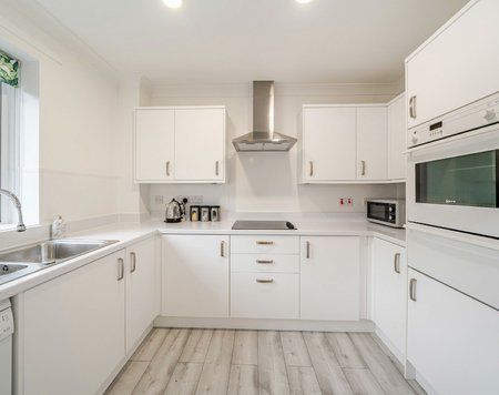 The living room features a charming Juliette balcony overlooking the back of the beautifully maintained communal gardens. It seamlessly connects to the kitchen, which offers a range of wall, base, and drawer units, a single basin, and space for appliances.