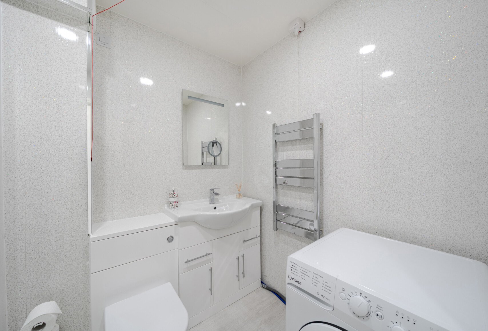 The property briefly comprises an entrance hall with built-in storage, leading to a shower room fitted with a white two-piece suite, including a WC, a pedestal washbasin, and a shower.
