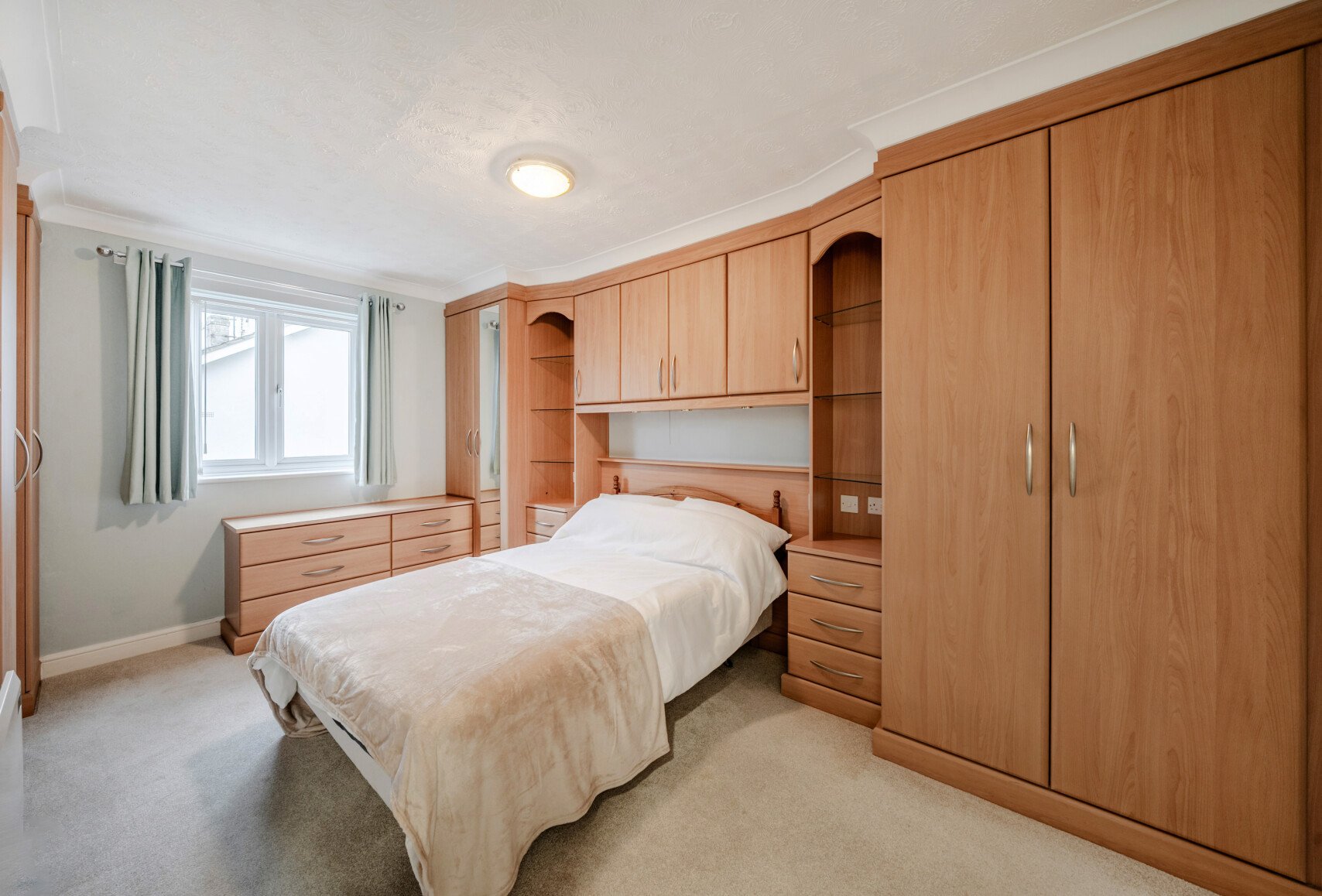 The primary bedroom benefits from ample built-in storage and an en-suite, complete with a separate shower, WC, and washbasin. Adjacent to the primary bedroom is the second bedroom, while additional built-in storage can be found in the hallway.