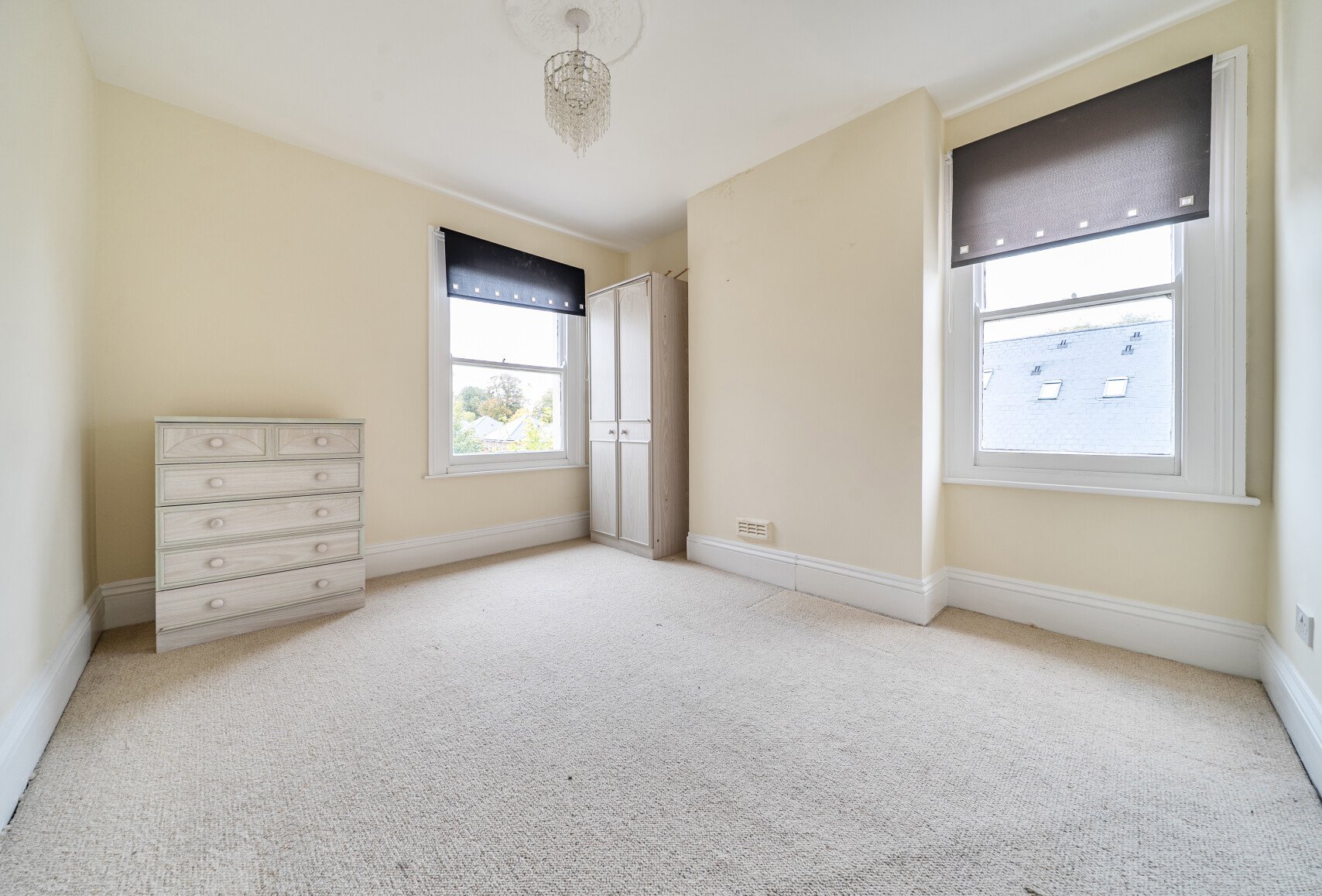 The spacious one-bedroom layout includes a large bay window, bijou black ironwork balcony, and high ceilings with period detailing.
