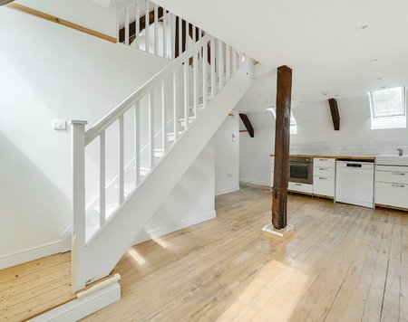 The home opens into a welcoming, spacious open-plan kitchen and dining area, ideal for everyday living and entertaining. A modern bathroom with contemporary fittings completes the ground floor. To the first floor is a double bedroom with great chimney top views.