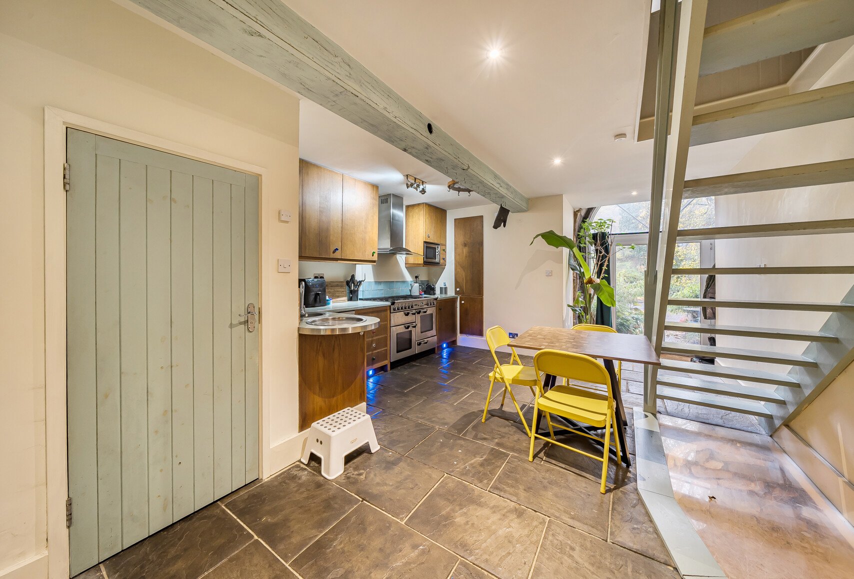 Upon entering through double-glazed double doors — perfect for moving furniture with ease — you’re greeted by a welcoming entrance leading into a beautifully crafted handmade kitchen, complete with oversized deep cupboards for generous storage, a built-in narrow dishwasher, microwave, and a Rangemaster oven with extractor above. The flagstone flooring features water-fed underfloor heating, adding both comfort and character.