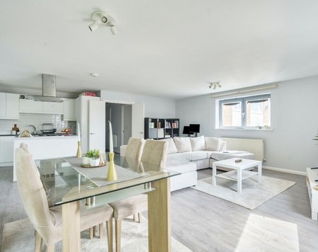 The open plan lounge / diner/ kitchen has integrated appliances and is flooded with an abundance of natural light due to multi aspect windows and sliding doors opening out to a South Facing balcony, creating an ideal space for entertaining.