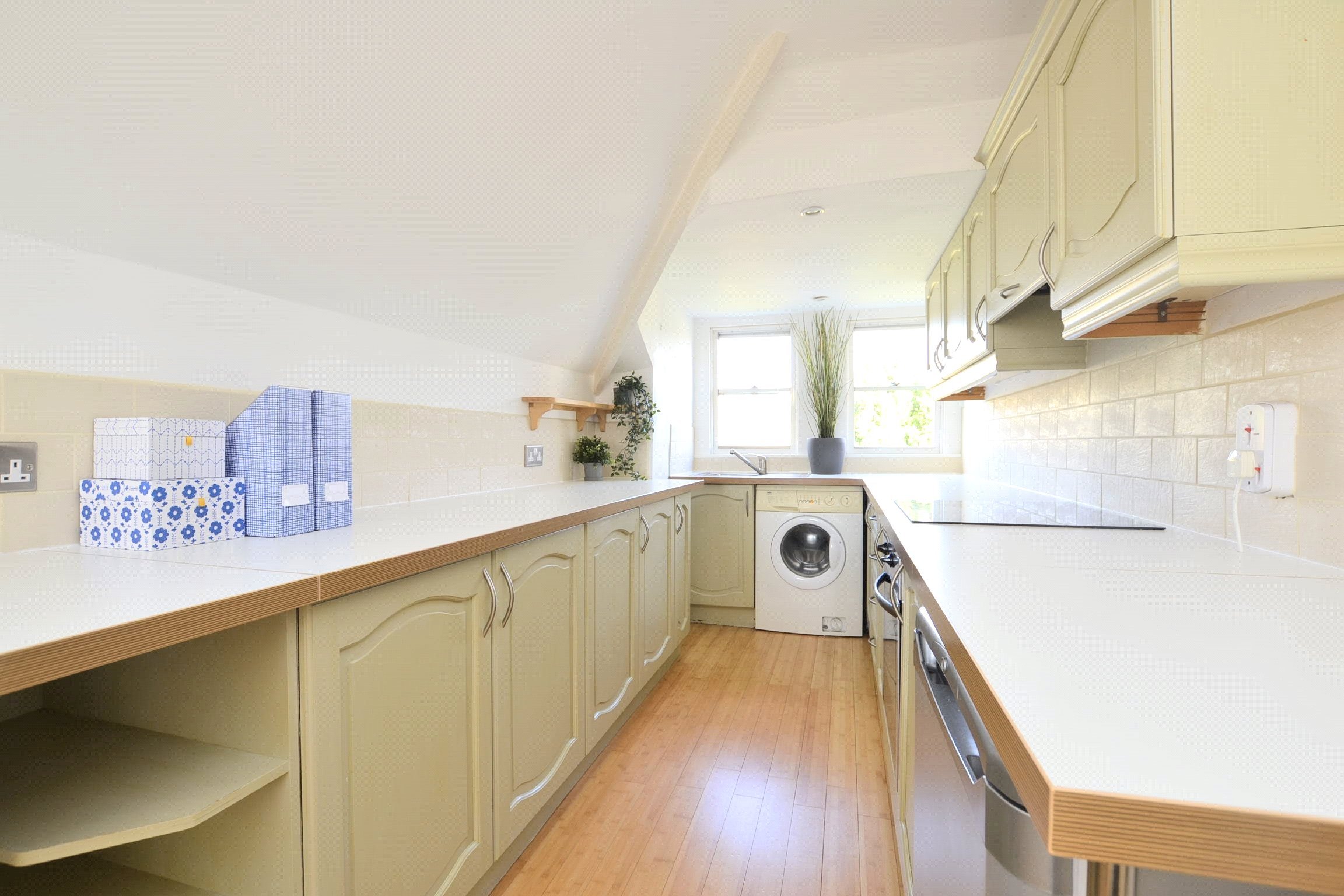 The heart of the home is the open-plan kitchen and living area. The galley style kitchen offers ample worktop space, enhanced by extended units that form a practical breakfast bar. It comes equipped with an integrated hob and oven, with additional space available for further appliances. A kitchen window looks out over surrounding greenery and gardens, adding to the home’s light and airy feel.