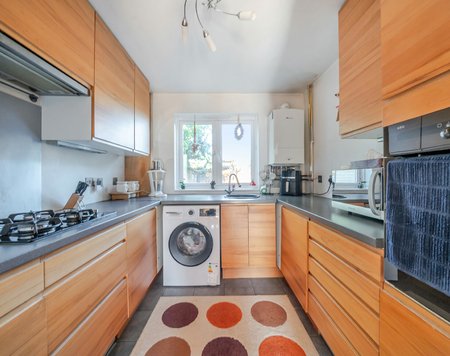Contemporary Kitchen – Fully fitted with ample storage, integrated electric fan oven, gas hob, and a garden-facing window.