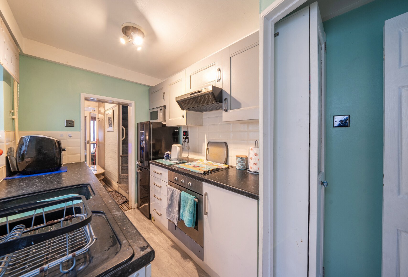 To the rear of the property is the galley kitchen, fitted with wall, base and drawer units, a single basin, and space for an appliance. Beyond the kitchen is the bathroom, comprising a WC, wash hand basin, storage cabinet, and a bathtub with an overhead electric shower.