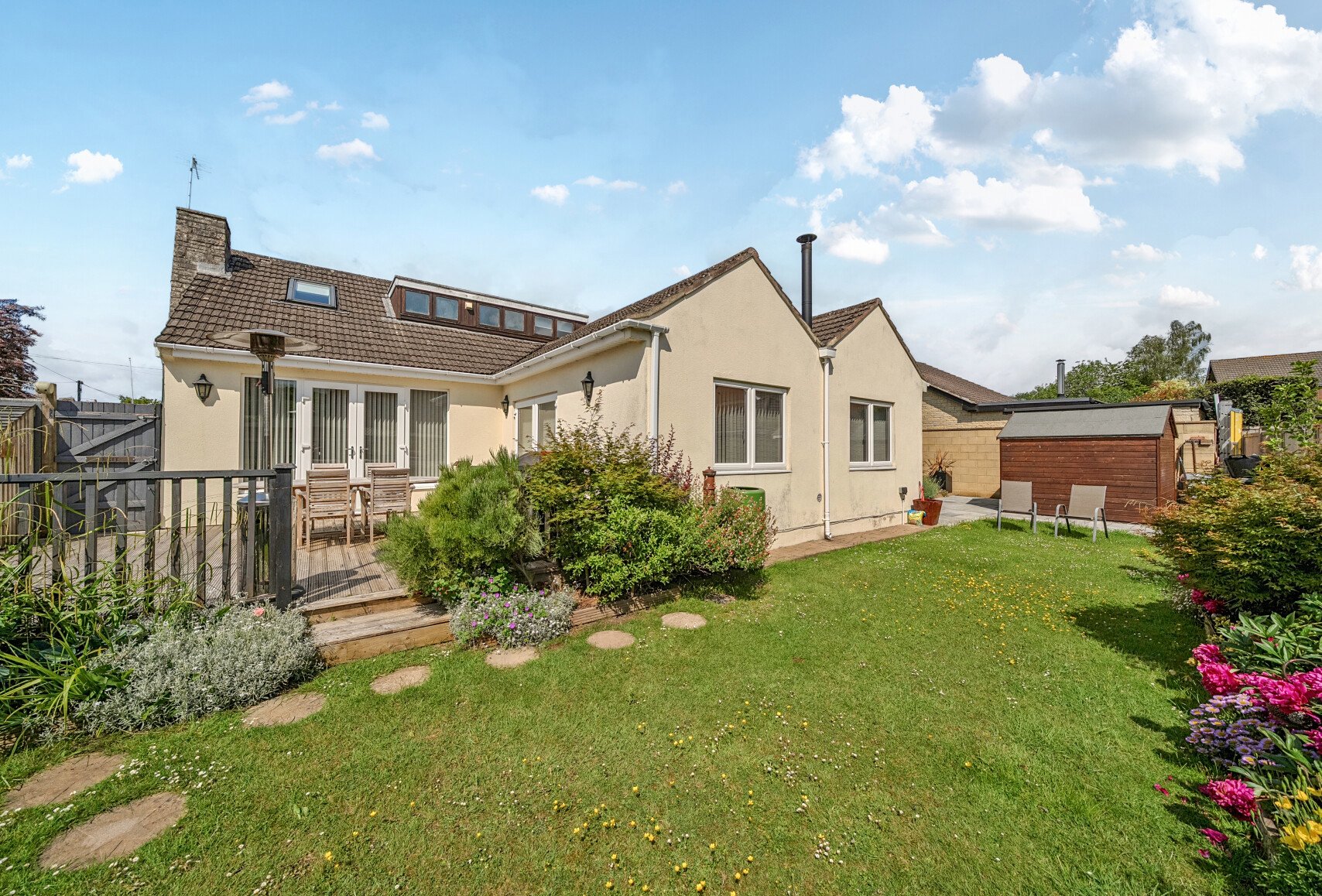 Outside, the property offers a gravelled drivewayleading to the main entrance, and an additional paved driveway to the side. The enclosed rear garden features a lawn with mature shrub and plant borders, steps up to a decked patio area, and a separate paved patio in front of the conservatory, complete with gated access.