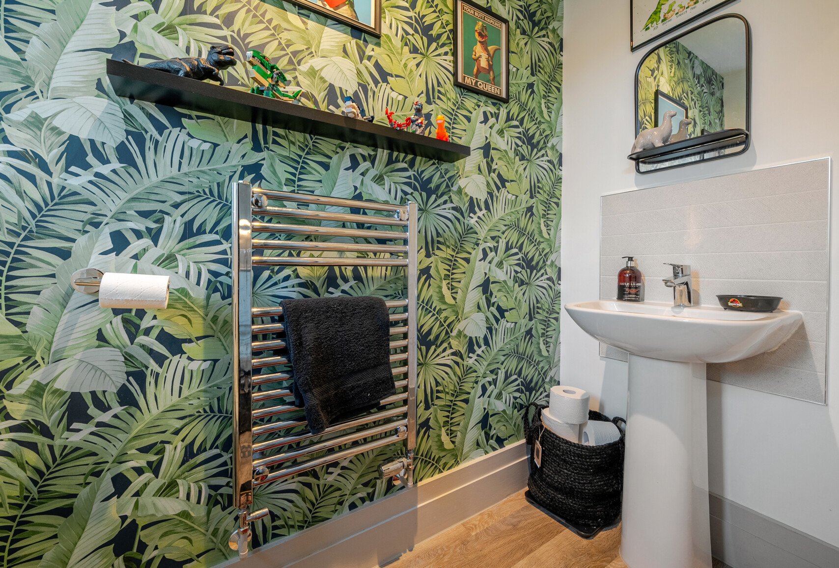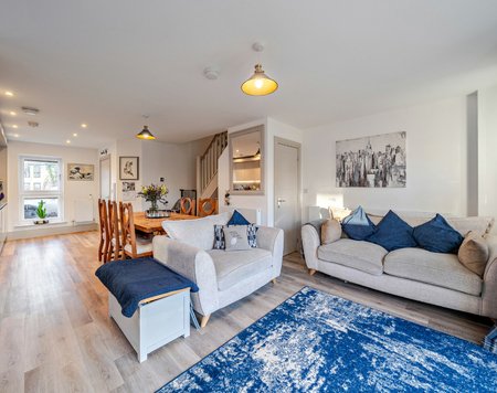 The ground floor welcomes you with an entrance hall, a sleek guest WC, and an impressive open-plan kitchen, dining and living space extending the full depth of the home. The kitchen is beautifully appointed with integrated appliances,