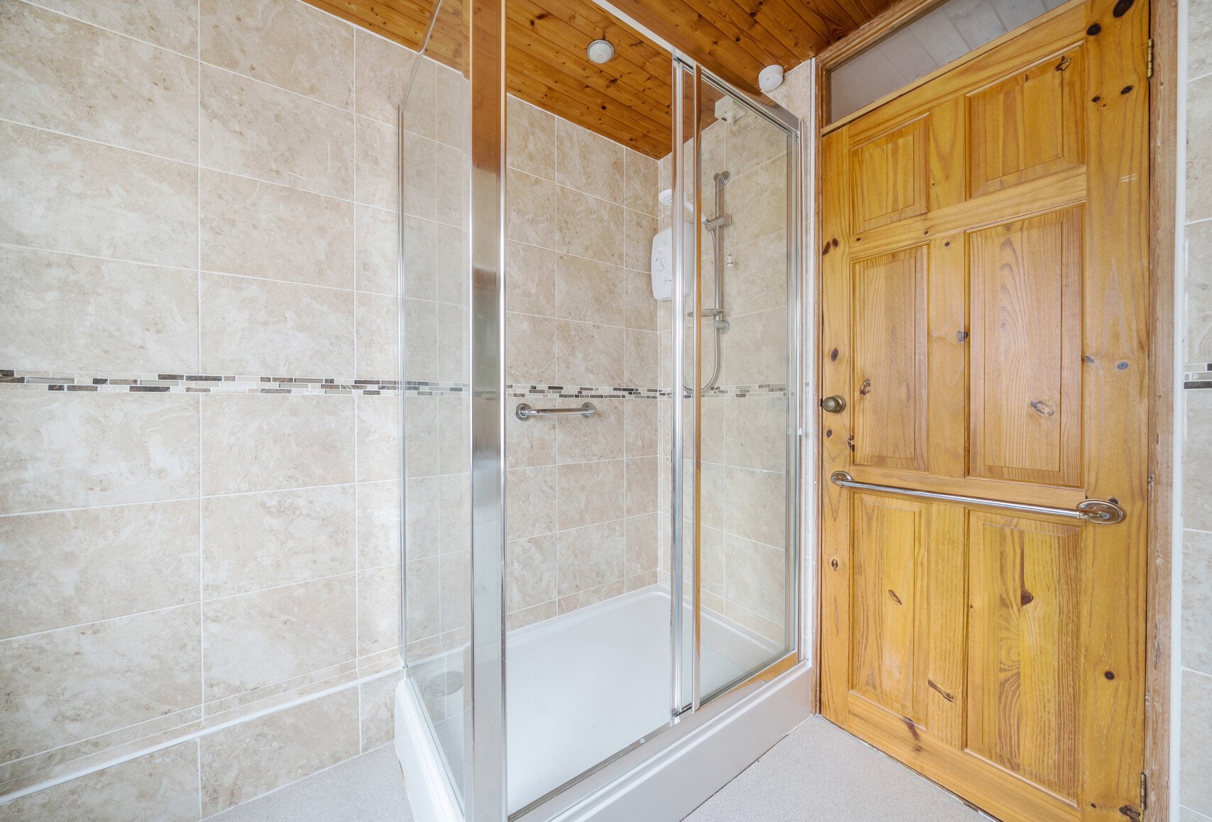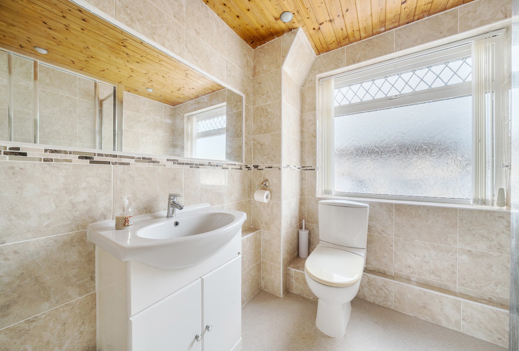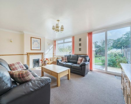 From the dining area, a small hallway leads to the spacious sitting room, a beautifully light space with a large picture window overlooking the rear garden and sliding doors opening directly onto the patio—ideal for indoor-outdoor living. Upstairs, there are three bedrooms: two generous doubles and a single currently used as a home office, alongside a contemporary family shower room.