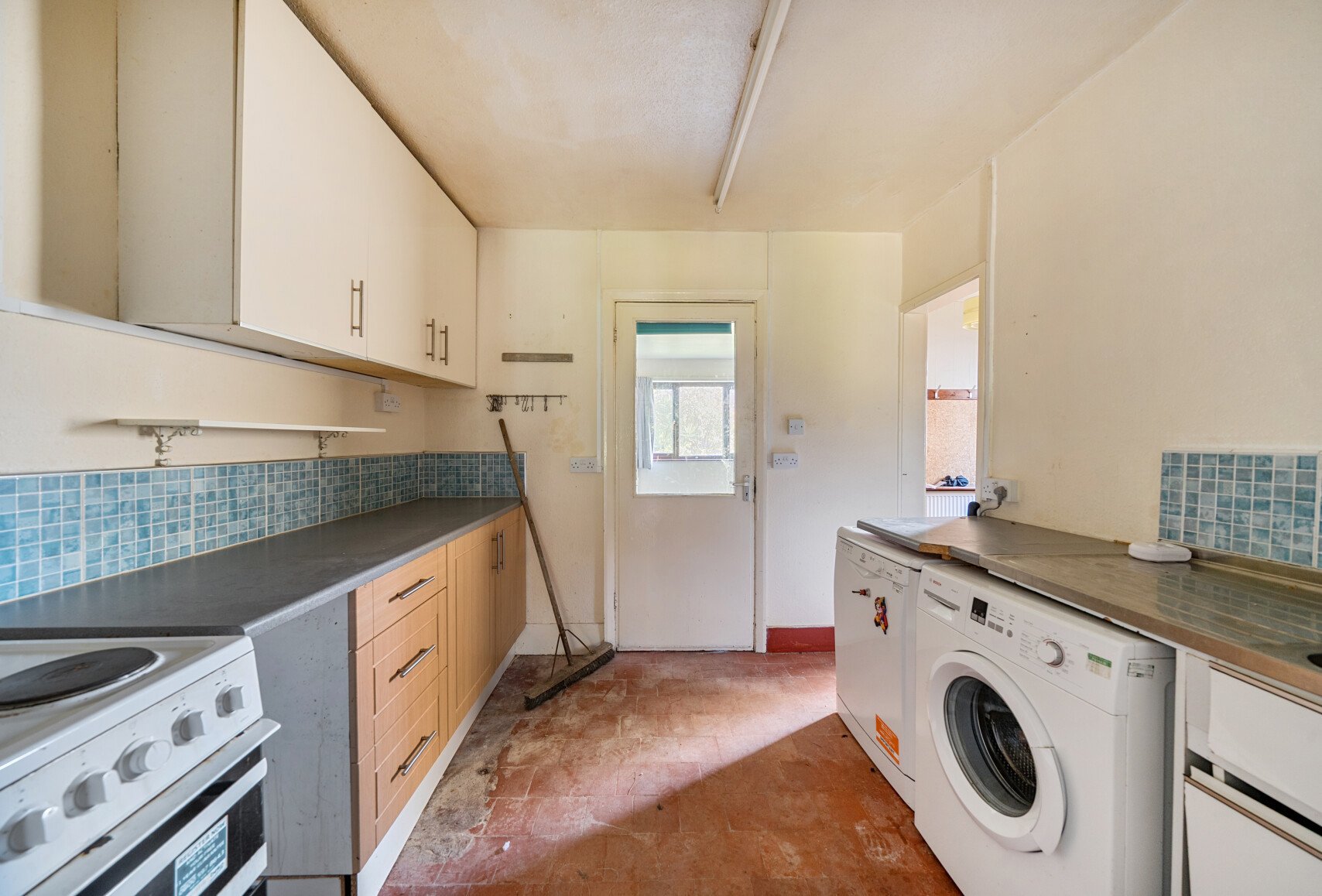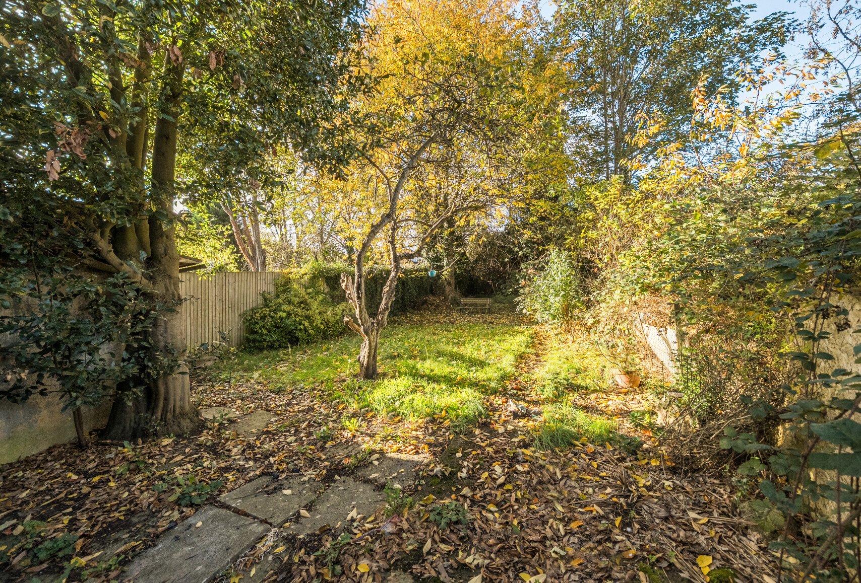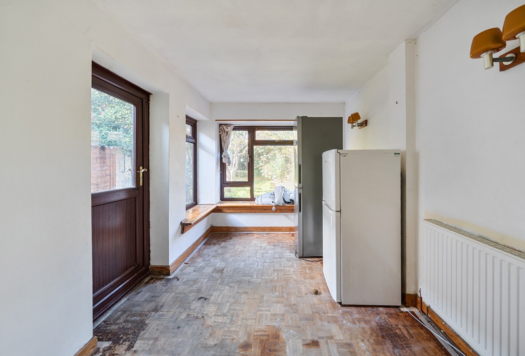 The bathroom is located on the ground floor, to the right of the entry way. Adjacent is the kitchen which flows into the dining room. The garden can be accessed through the door to the side of this room. The garden can also be accessed from the left side of the property.