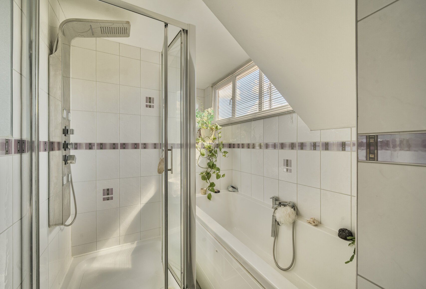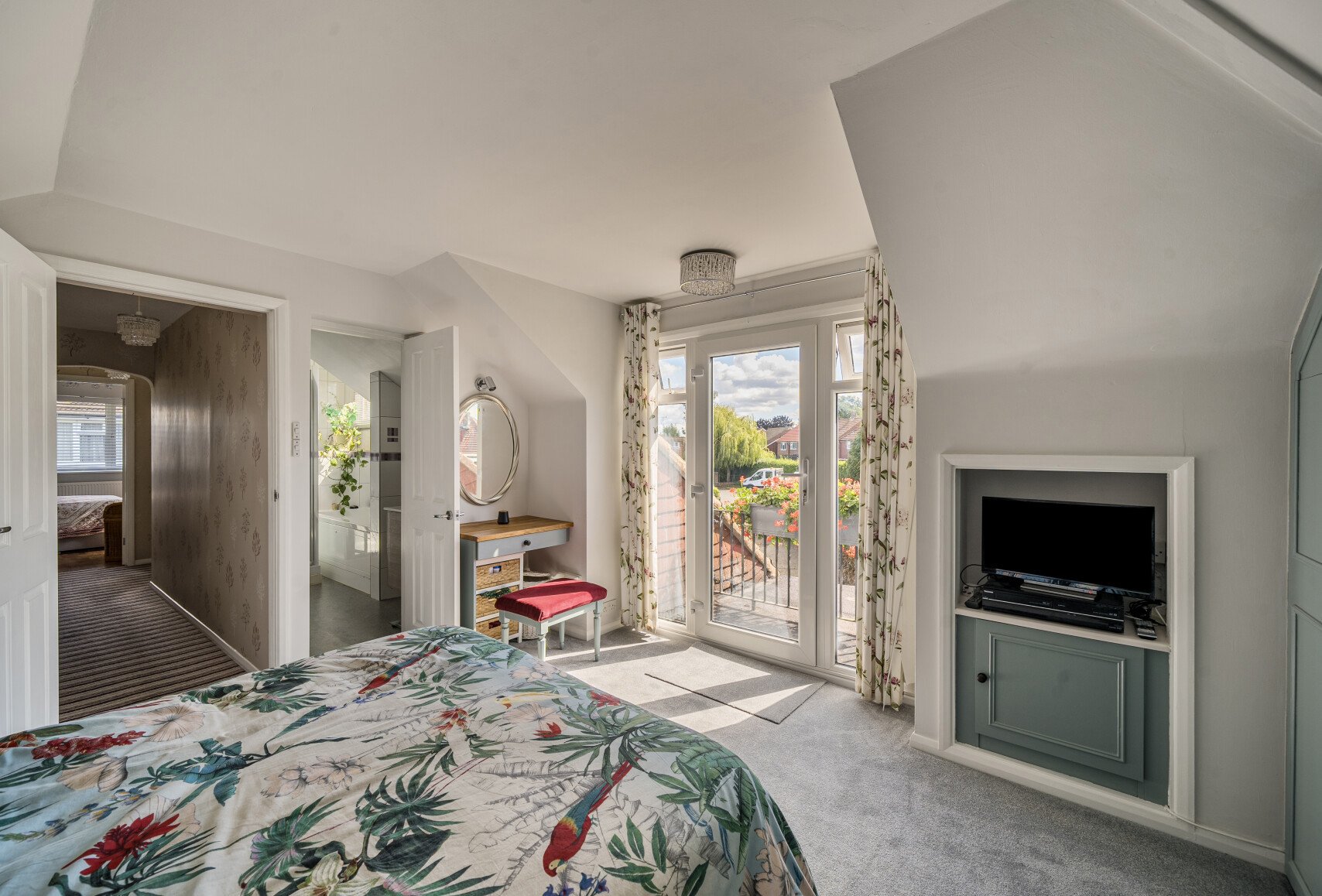 Upstairs, the main bedroom suite makes excellent use of space, benefiting from built-in storage, a Juliet balcony, and a private en-suite bathroom with a shower. It's a true retreat, offering peace and privacy.