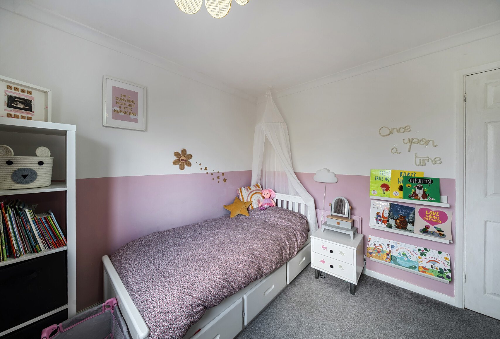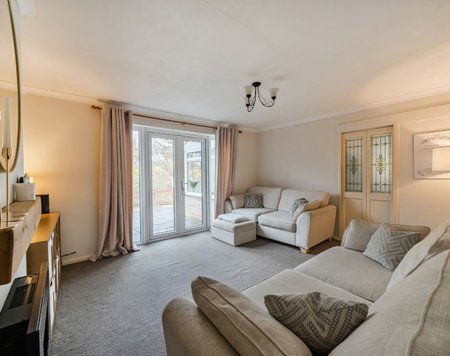 The property is approached via a driveway, with level access available from the side gate installed in 2024, making entry practical and convenient. A welcoming entrance hall with recently updated flooring (May 2025) leads into a bright sitting room, featuring French doors opening onto the patio and garden, where the views can be enjoyed. The kitchen offers good storage and worktop space, opening into a light-filled dining area ideal for family meals or entertaining. A versatile fourth bedroom on the ground floor serves well as a playroom, guest room or study.