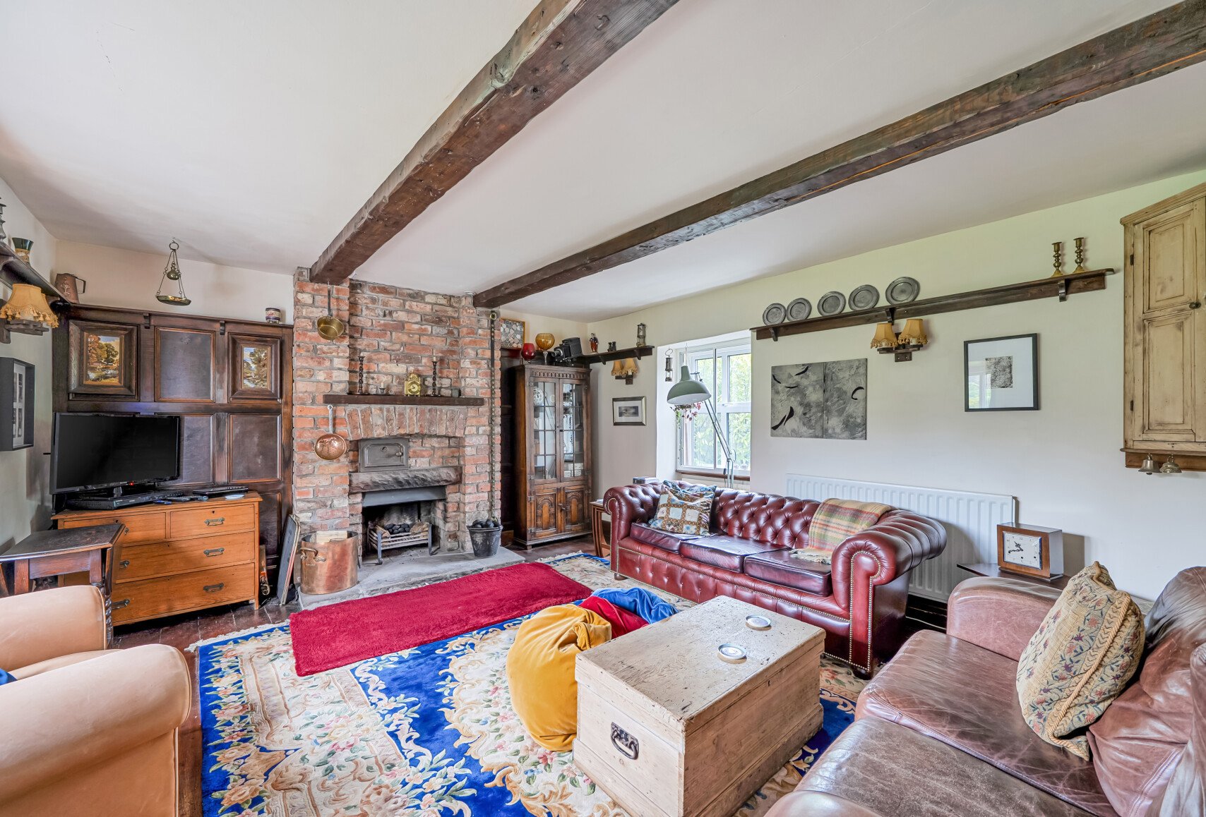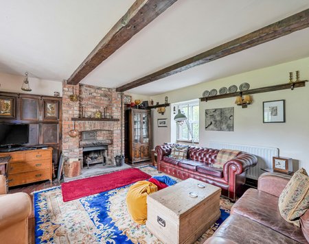 The ground-floor sitting room is bathed in natural light, with a dual-aspect bay window overlooking the garden and features a striking red-brick fireplace set on a York-stone hearth. Exposed wooden floorboards and sturdy ceiling beams enhance the historic warmth and character of this space. The heart of the home is its generous 23-ft kitchen/breakfast room, thoughtfully designed with a mix of wall and base units, a built-in double oven and hob, and a charming inglenook fireplace that houses a Rayburn. Adjacent, a study, accessible via a few steps, offers flexible living space that could serve as a home office or reading room. A second staircase here also leads to the first-floor accommodation, adding to the fluid and layered layout of the property. Completing the ground floor is a practical utility/boot room and a downstairs cloakroom.