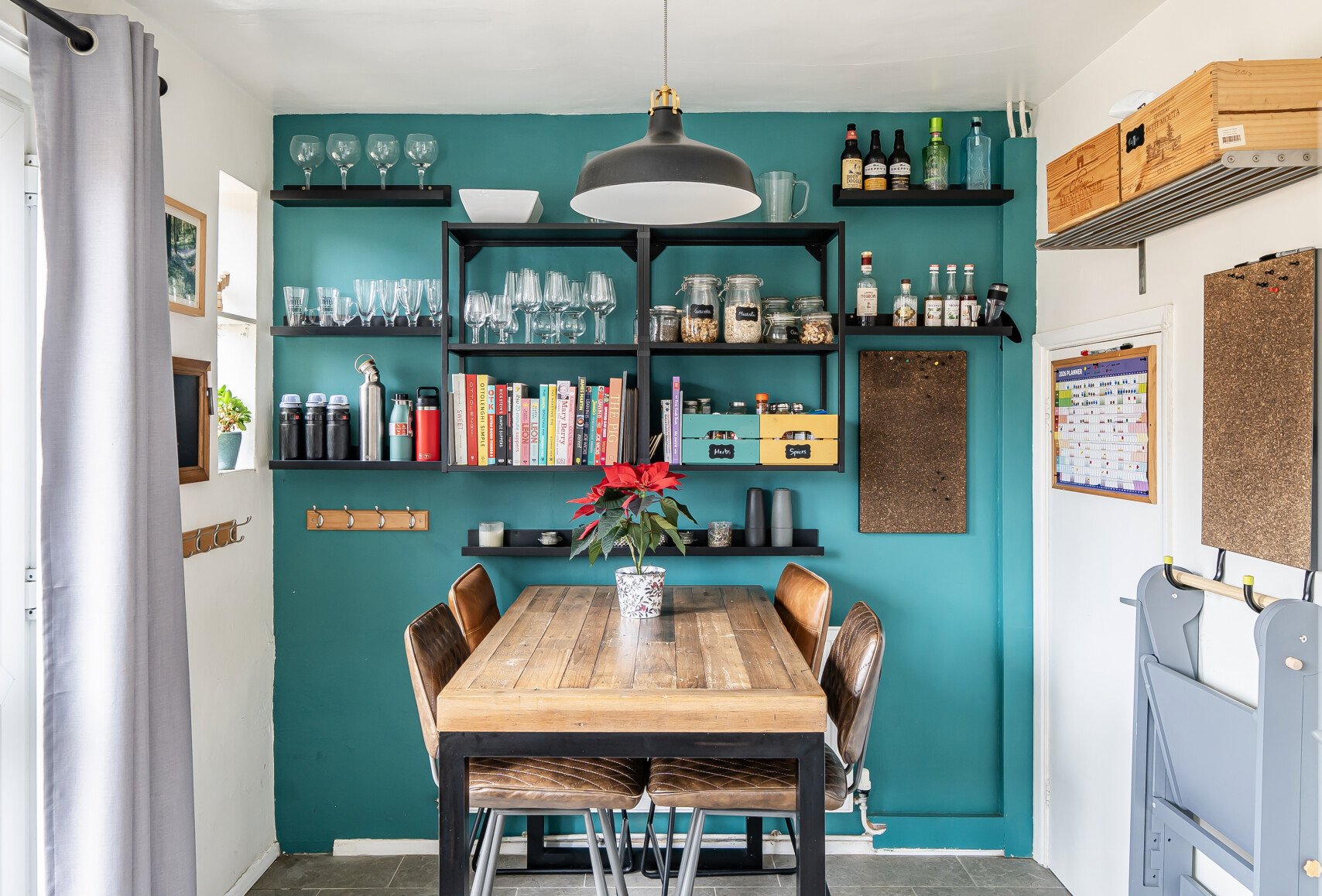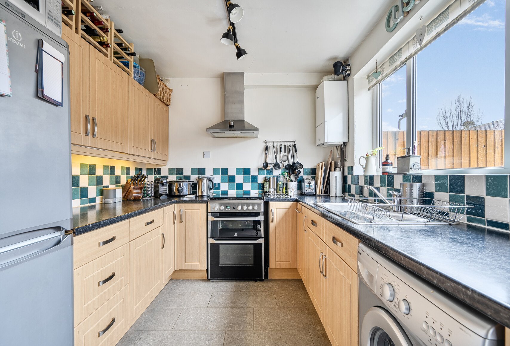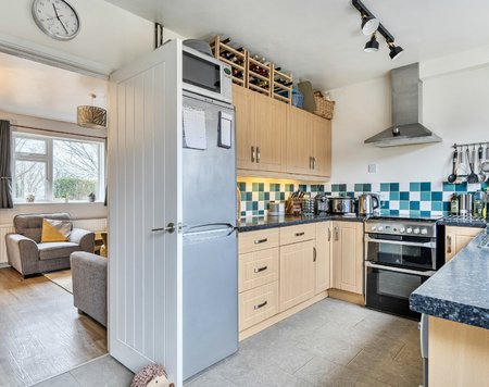 The kitchen is fitted with practical wall and floor units and includes a gas oven, hob, and extractor fan. There is space for a dining table and direct access to the garden, making it ideal for everyday living and entertaining.