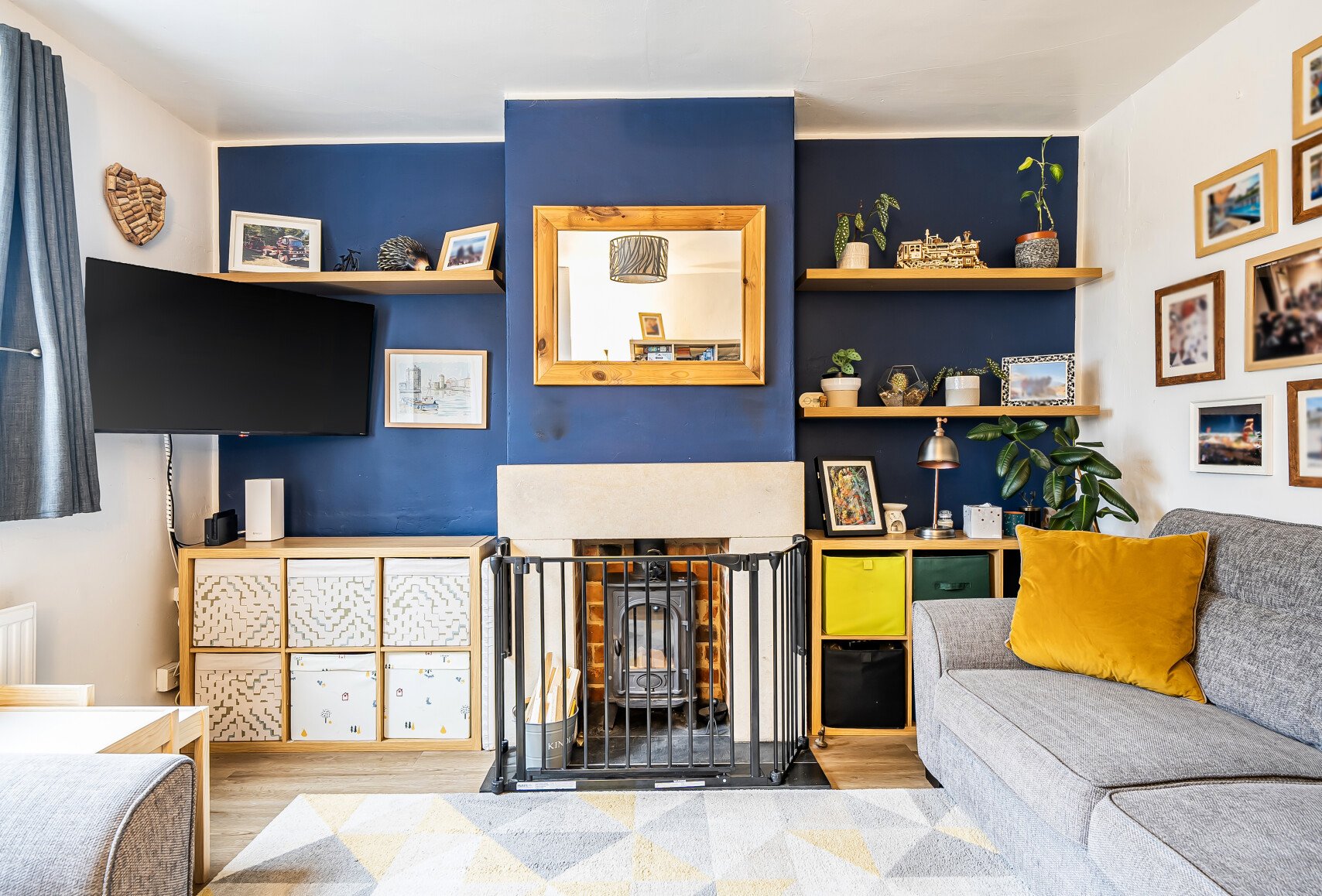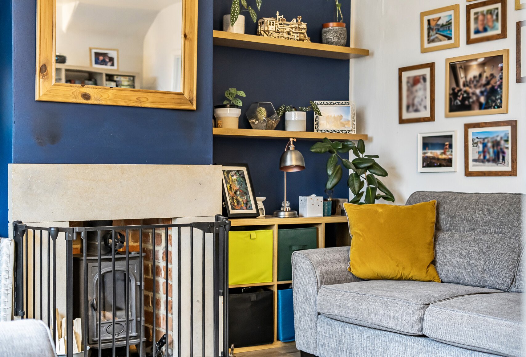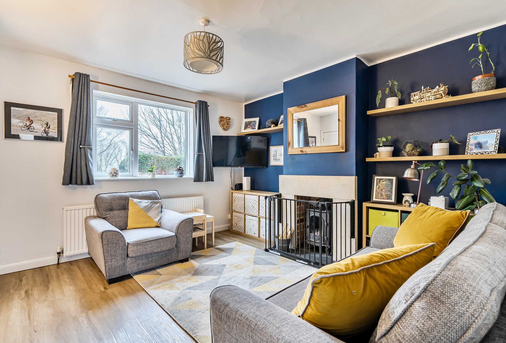 The sitting room is warm and inviting, featuring a wood-burning stove, a window overlooking open fields, and ample space for comfortable seating, creating a cosy and welcoming atmosphere.