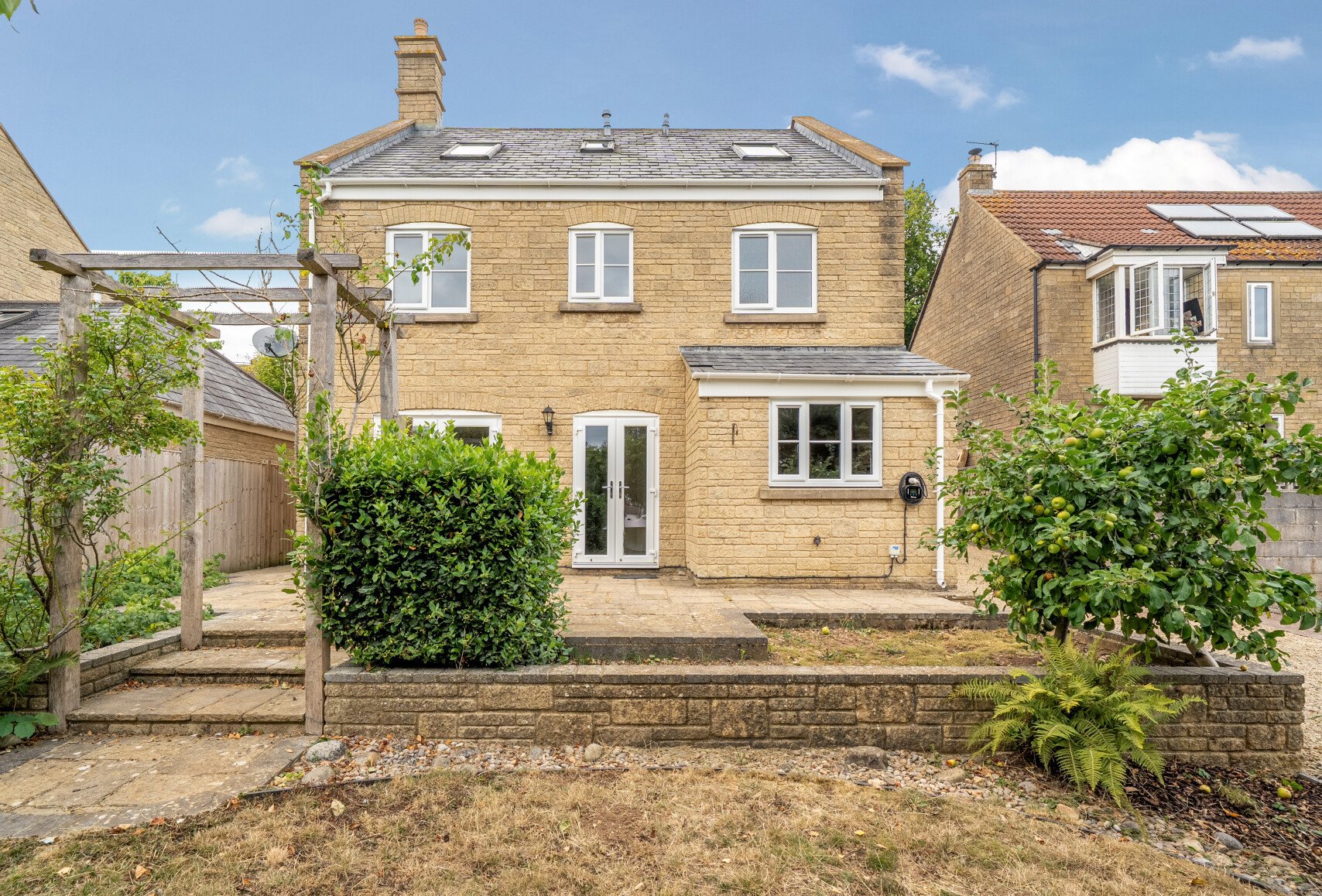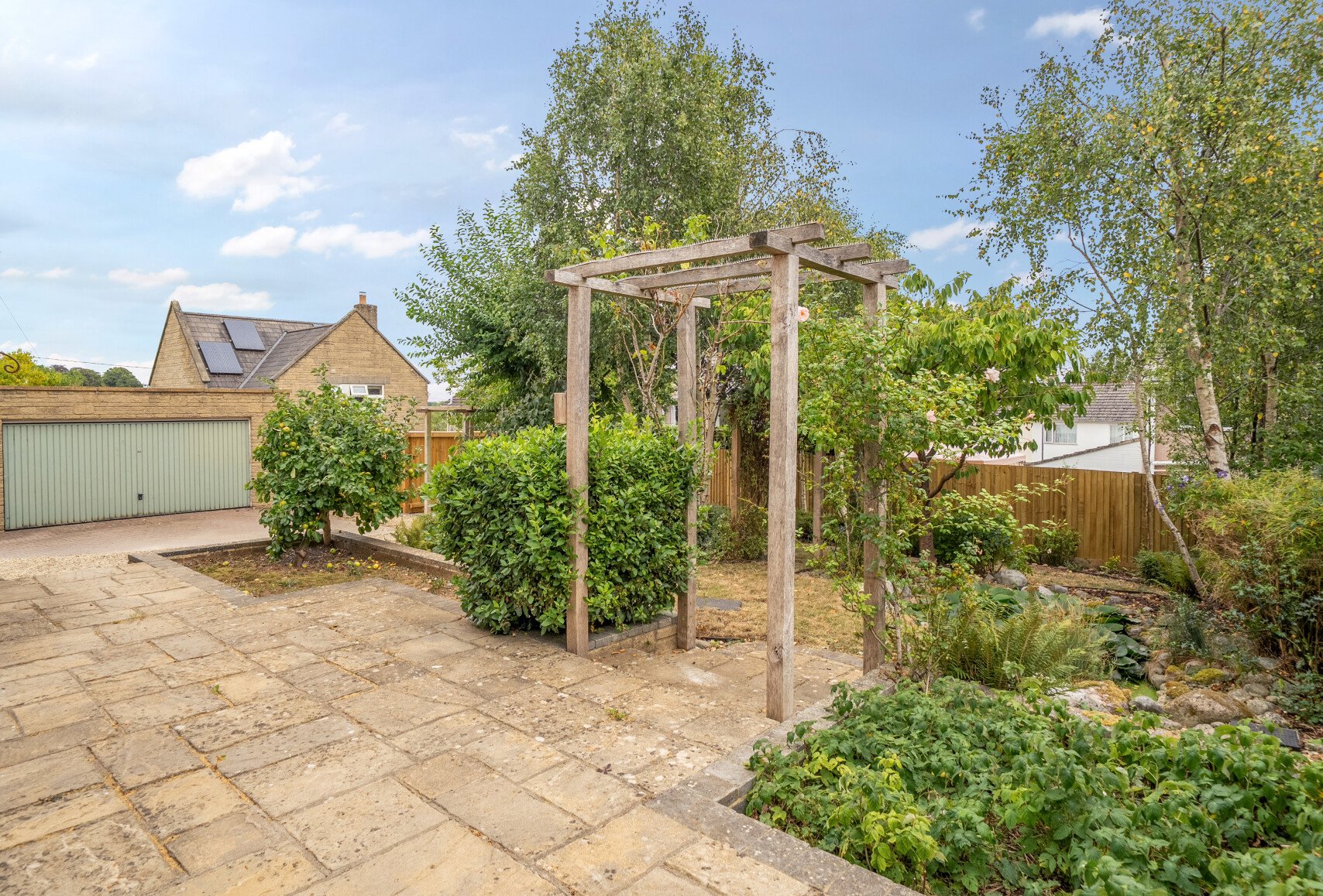 Outside, the home continues to impress. The front garden is neatly framed with shrubs and iron railings, while the rear garden is a haven of greenery, with mature trees, a patio terrace, lawn, and even a pond. With gated side access, a driveway, and a detached double garage, this property is both practical and charming.