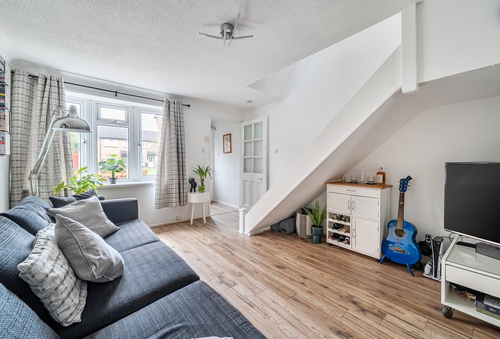 A classic picket fence front garden sets a welcoming first impression, leading to a cosy porch that opens into a bright and inviting lounge. This lovely room features an open staircase rising to the first floor, creating a sense of space and flow.