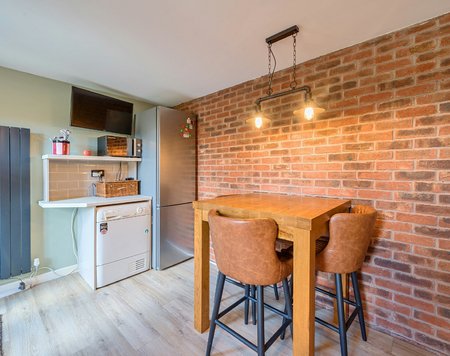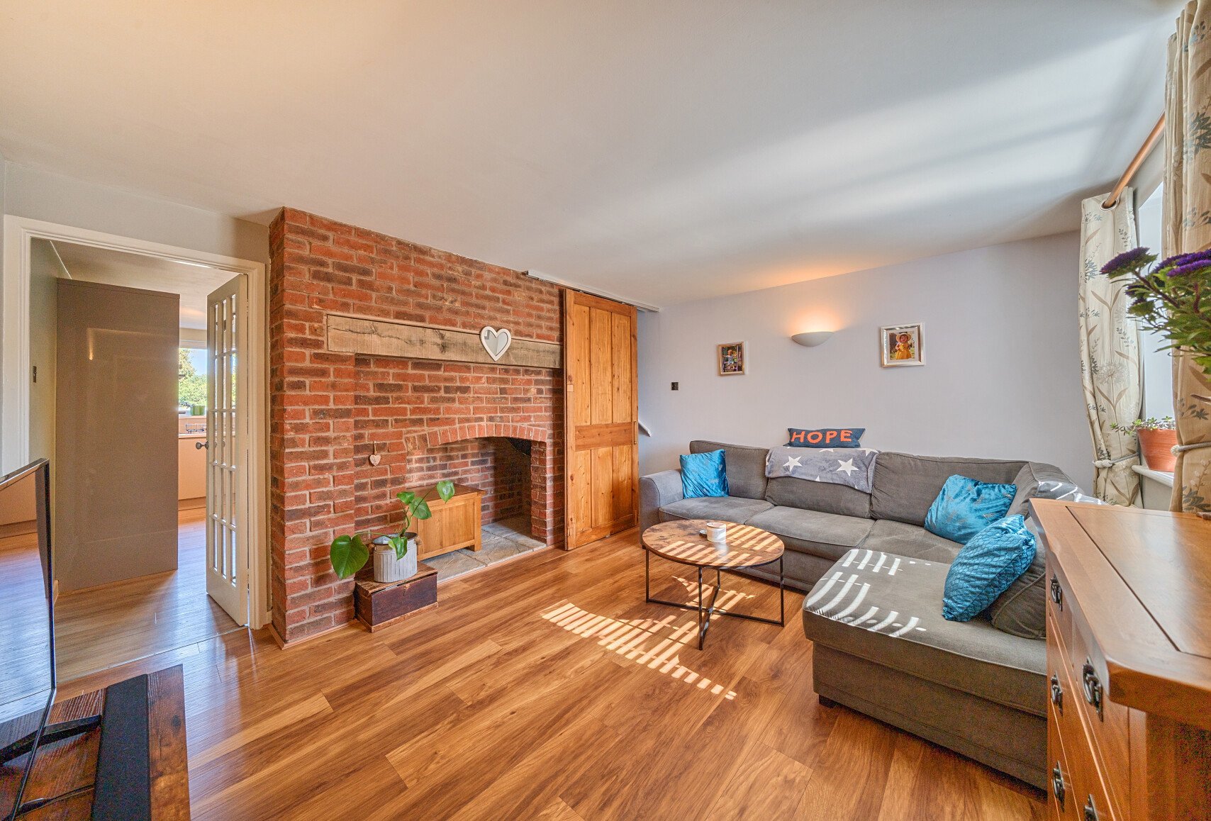 The ground floor features a front-facing living room with a brick feature wall and fireplace. The rear kitchen/diner also includes an exposed brick wall and has direct access to the rear garden through patio doors.