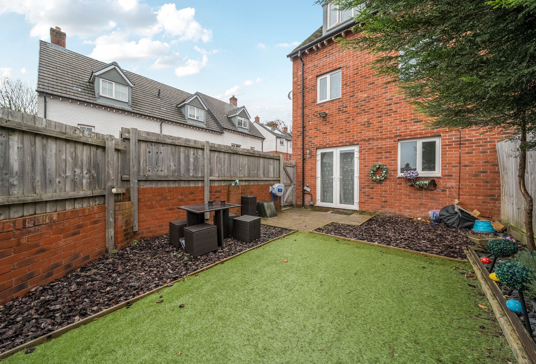 The ground floor welcomes you with a bright and inviting living room, ideal for relaxing after a long day, while the modern kitchen/diner provides the perfect setting for family meals or entertaining guests. French doors open out to the private rear garden, complete with both patio and lawn areas, a peaceful and low-maintenance space to enjoy the sunshine. A handy downstairs WC completes this level.