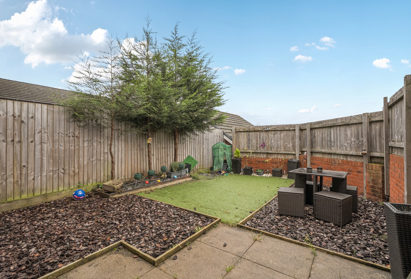 Outside, the rear garden has been neatly landscaped, offering a great balance of patio, lawn, and privacy fencing, perfect for summer barbecues or a quiet morning coffee. The home also comes with a detached Garage located to the side of the house.