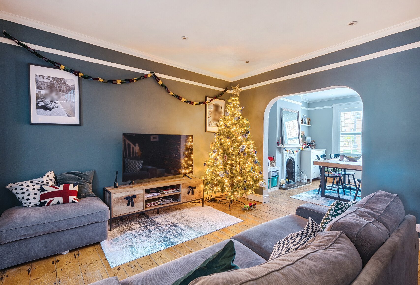 This handsome home enjoys a west-facing frontage and an east-facing rear garden, offering excellent morning sunshine and a bright, welcoming feel. The front door opens into a small vestibule and through to the sitting room, which flows semi–open plan into the dining area via an attractive archway. The dining room benefits from evening light and features a period fireplace, stripped floorboards and shutters. The sitting room has a warm, comfortable character, with a hatch and a door leading to the kitchen. The kitchen provides a practical and inviting space, fitted with a range of units and a useful breakfast bar, with doors opening to the enclosed, level rear garden, mainly laid to lawn and offering scope for personal landscaping.