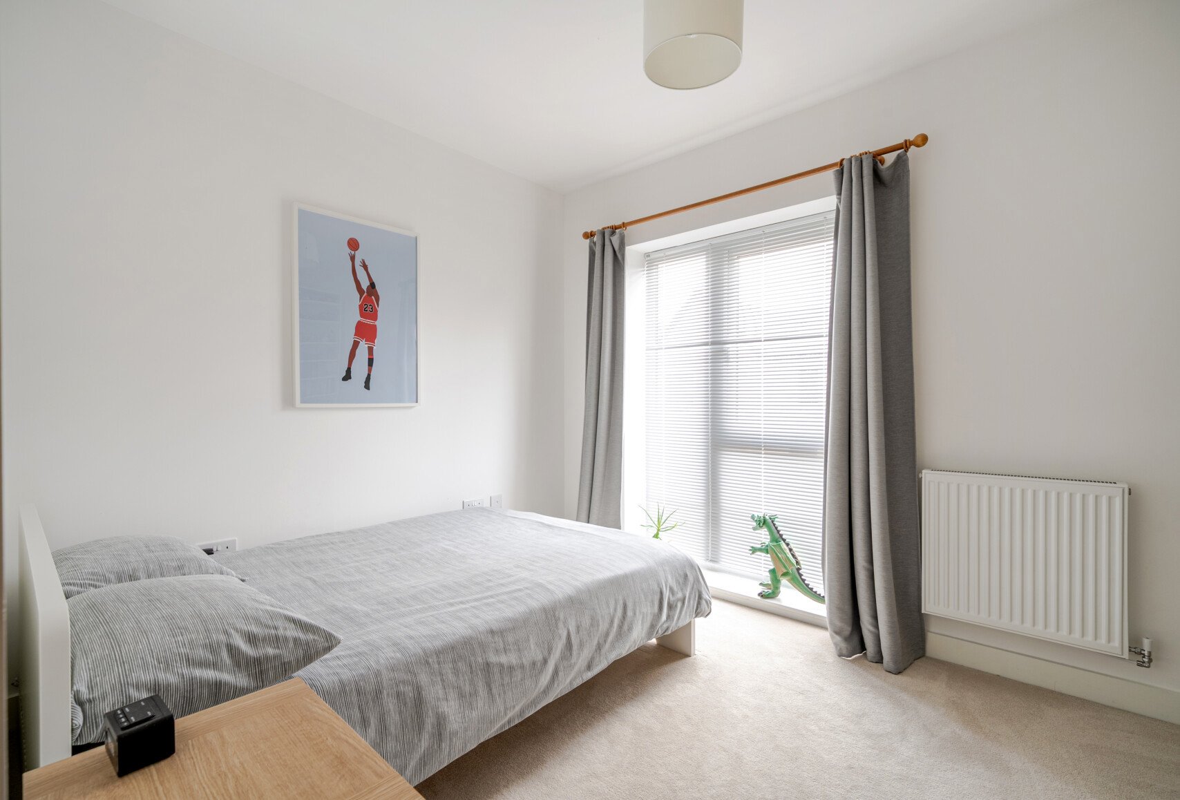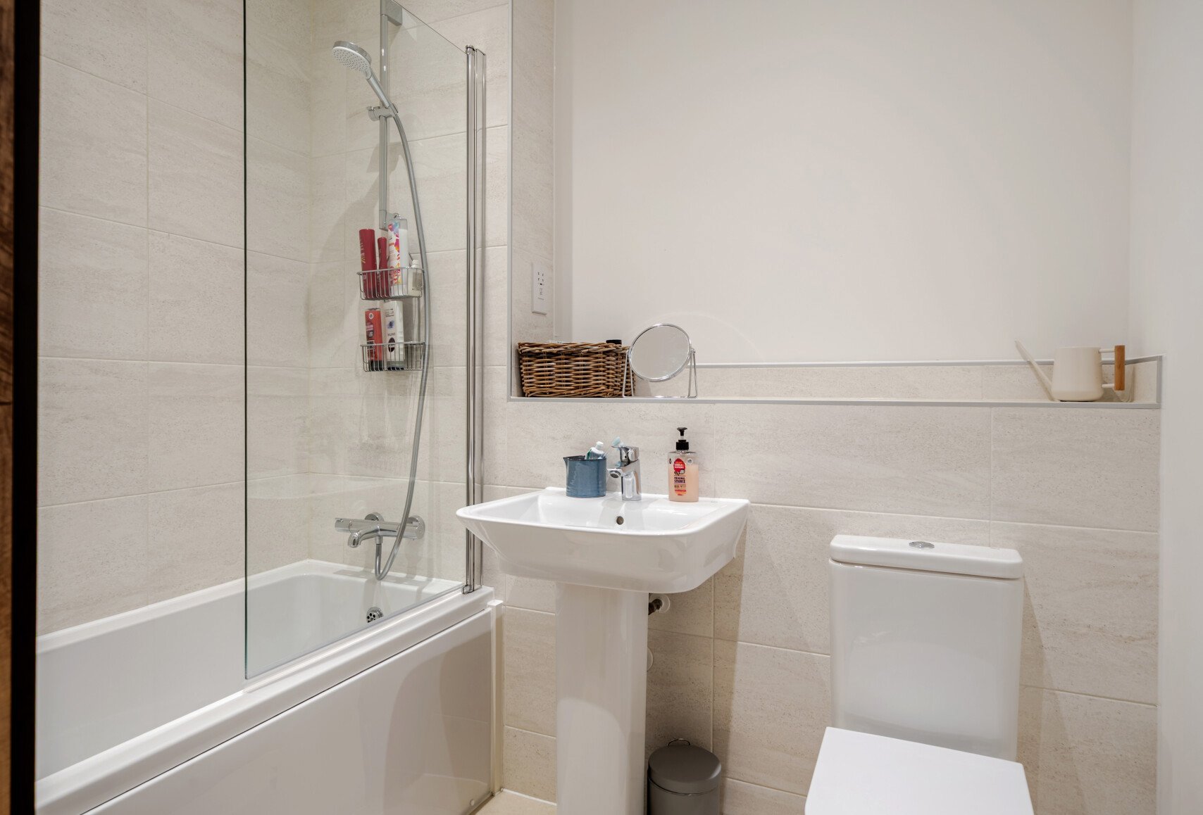 Upstairs, there are two well-proportioned double bedrooms. The larger bedroom measures approximately 13'7" x 9'3" and includes a built-in cupboard, while the second measures 13'7" x 8'11" and also features built-in storage. A modern three-piece family bathroom, with shower over the bath, is accessed from the landing.