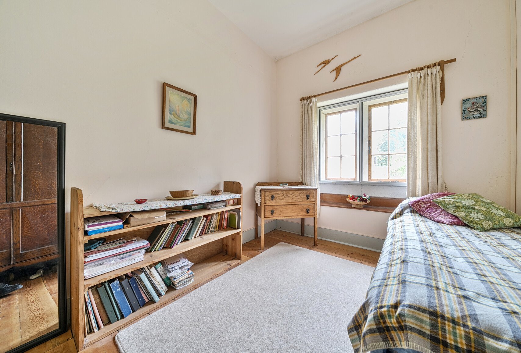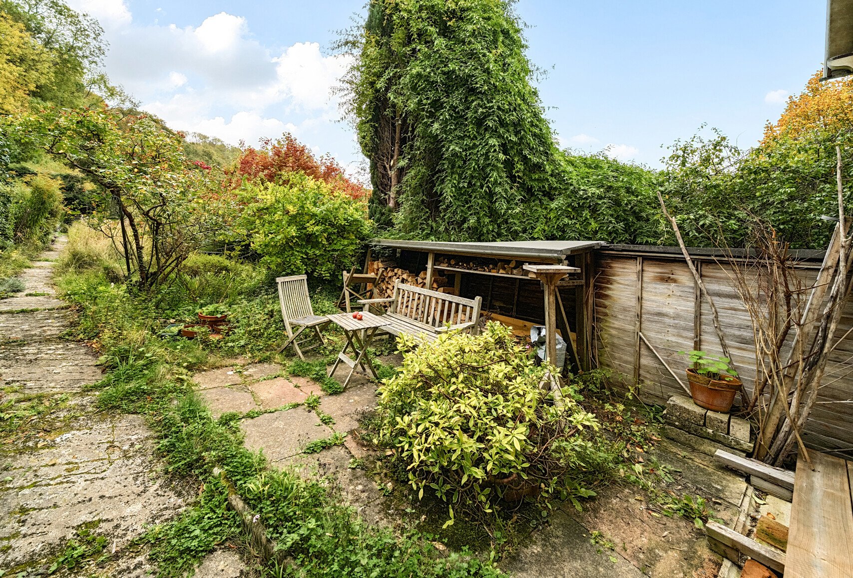 Outside, the garden is planted with fruit, vegetables, and naturalised flowers, creating a colourful haven for wildlife throughout the year. A rear footpath provides convenient access behind the terrace, and an outside store offers extra storage.