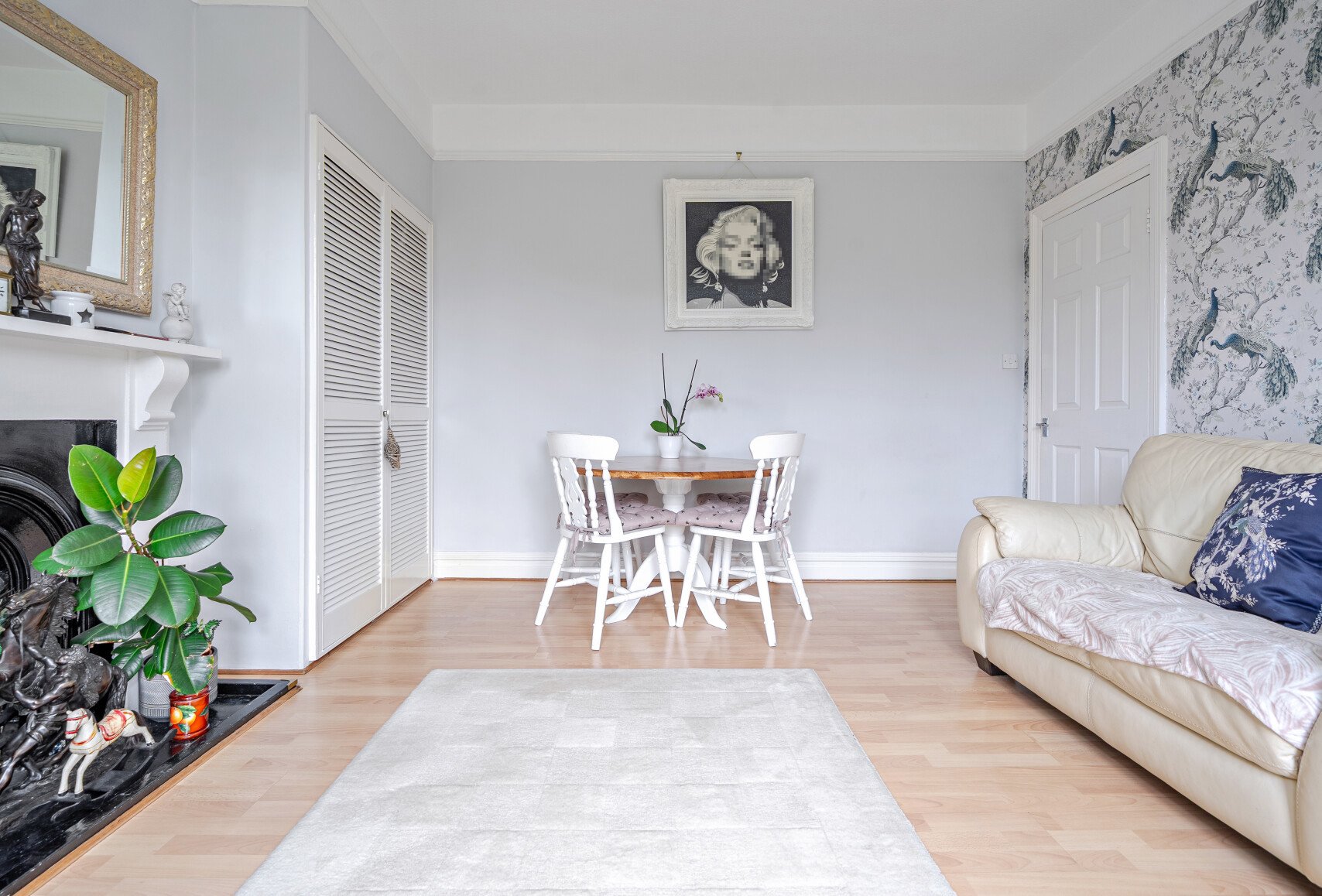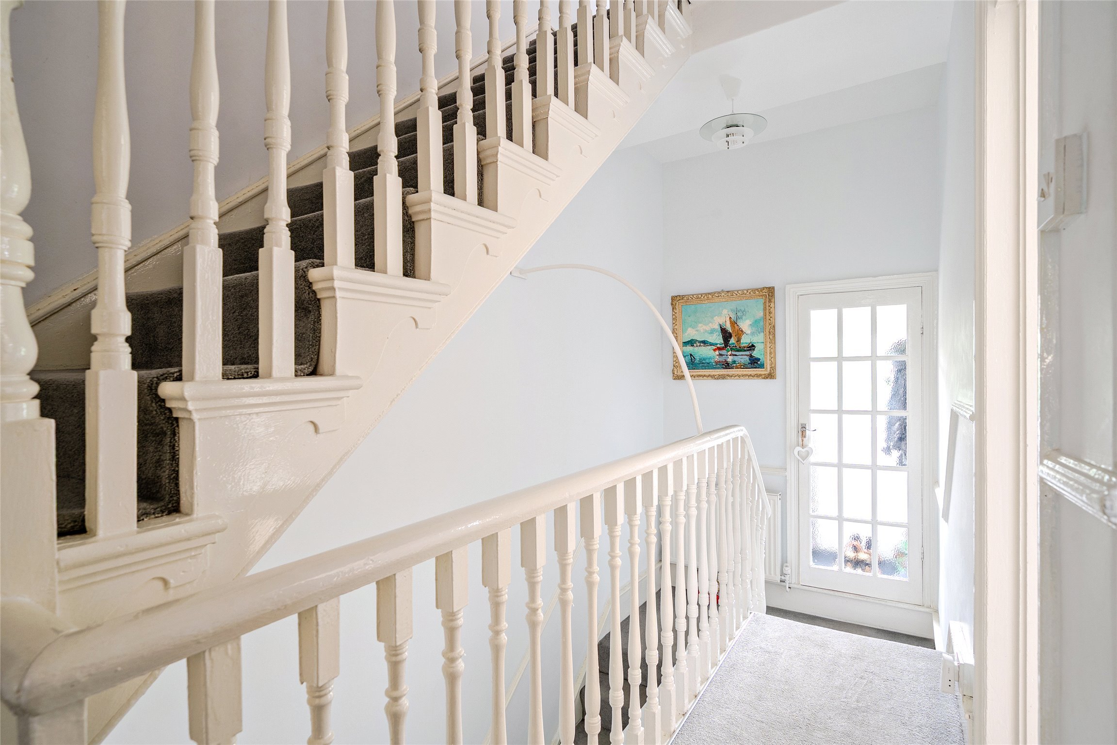 Once inside, stairs rise to a bright first floor landing, leading to a wonderfully light filled south facing sitting room. This elegant space features two generous sash windows that bathe the room in natural light, along with a charming feature fireplace that adds warmth and character.