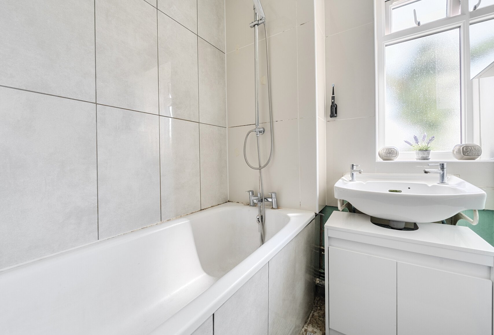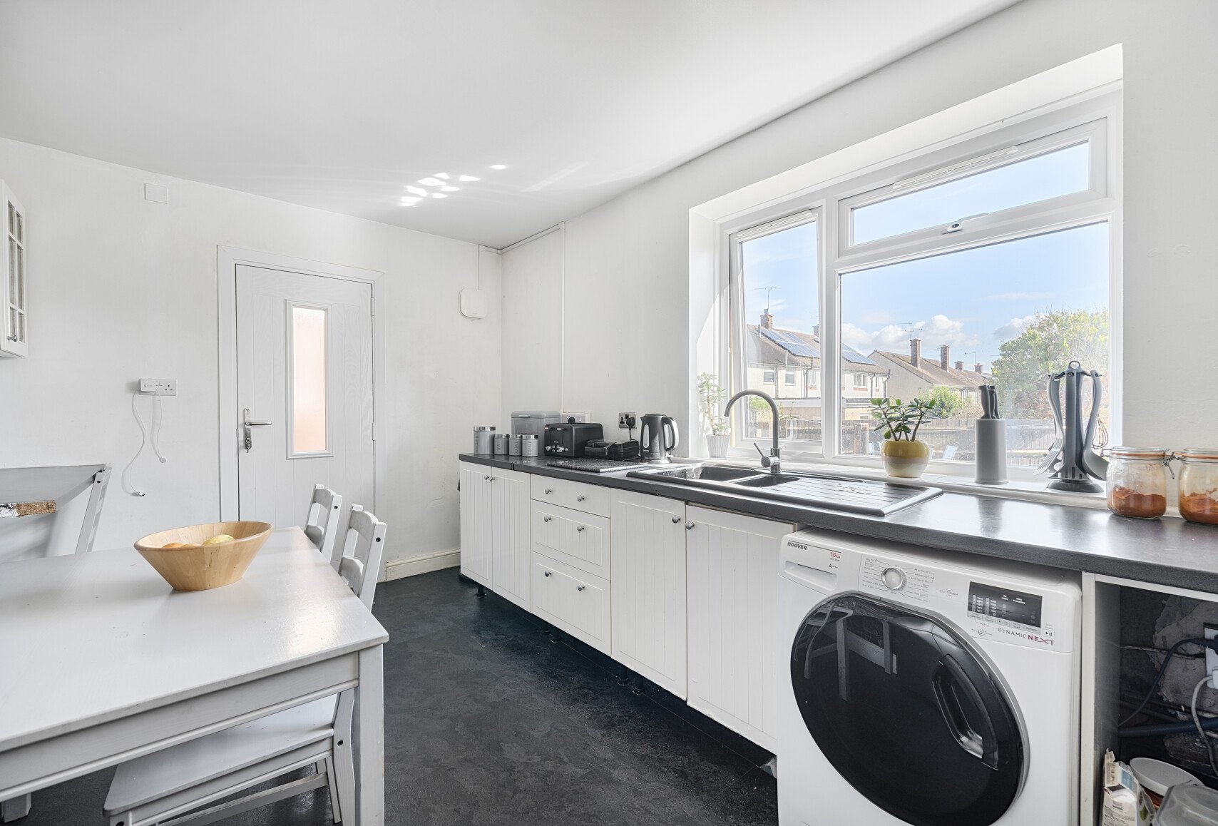 The property briefly comprises an entrance hall, a light and airy sitting room measuring 14'4" x 11'5", and a larger-than-average kitchen fitted with wall, base, and drawer units, a single basin, and space for appliances, overlooking the rear garden. The bathroom features a wash hand basin, a bathtub with an overhead shower, and a separate WC. The primary bedroom (11'7" x 11'5") is located at the front of the property, with the second bedroom to the rear.