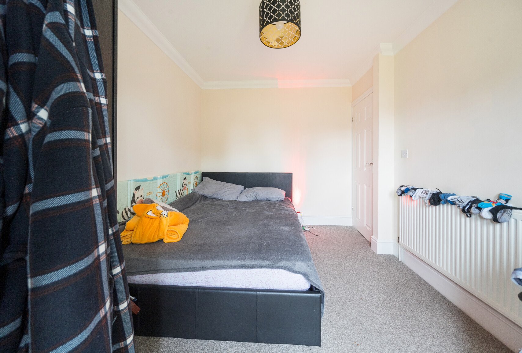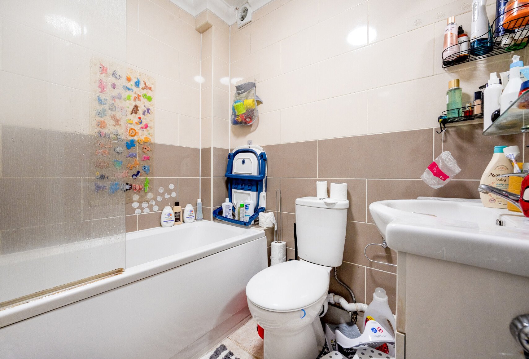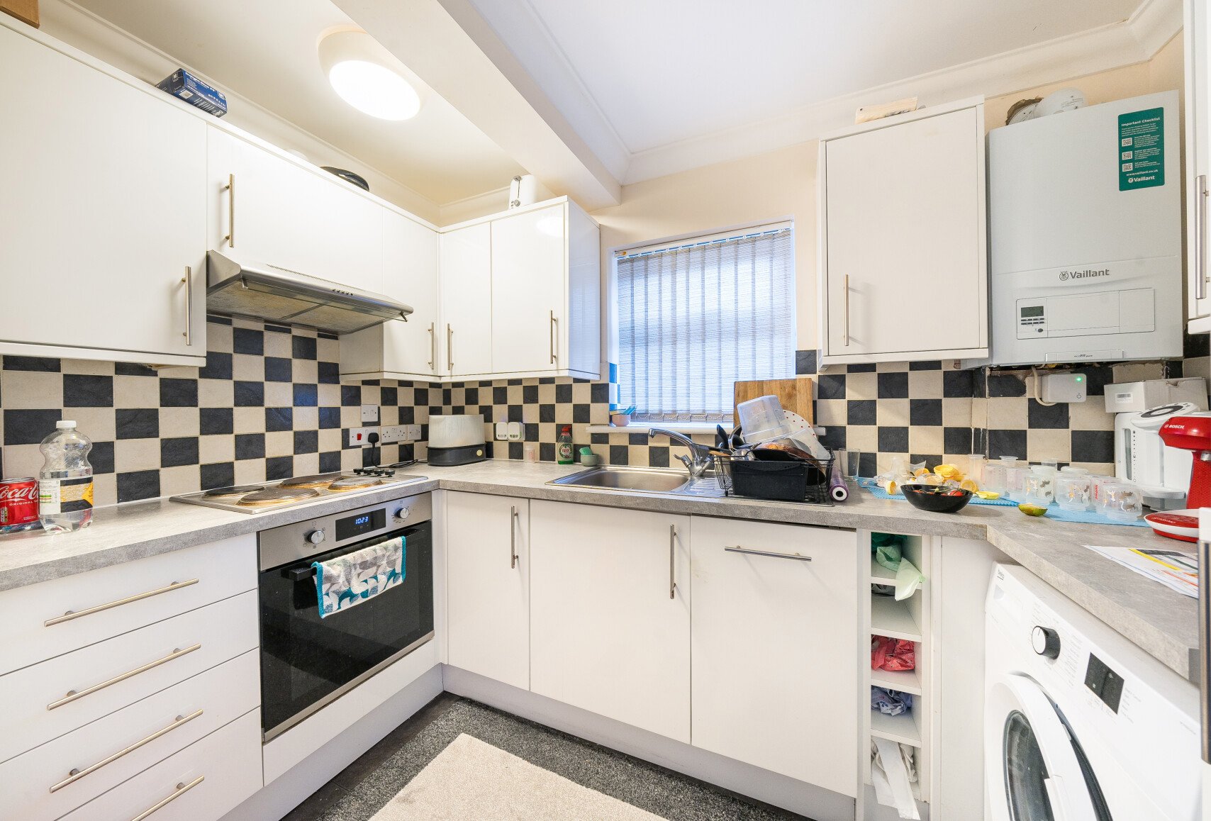 Offered unfurnished with white goods in the kitchen and an electric shower above the bath,