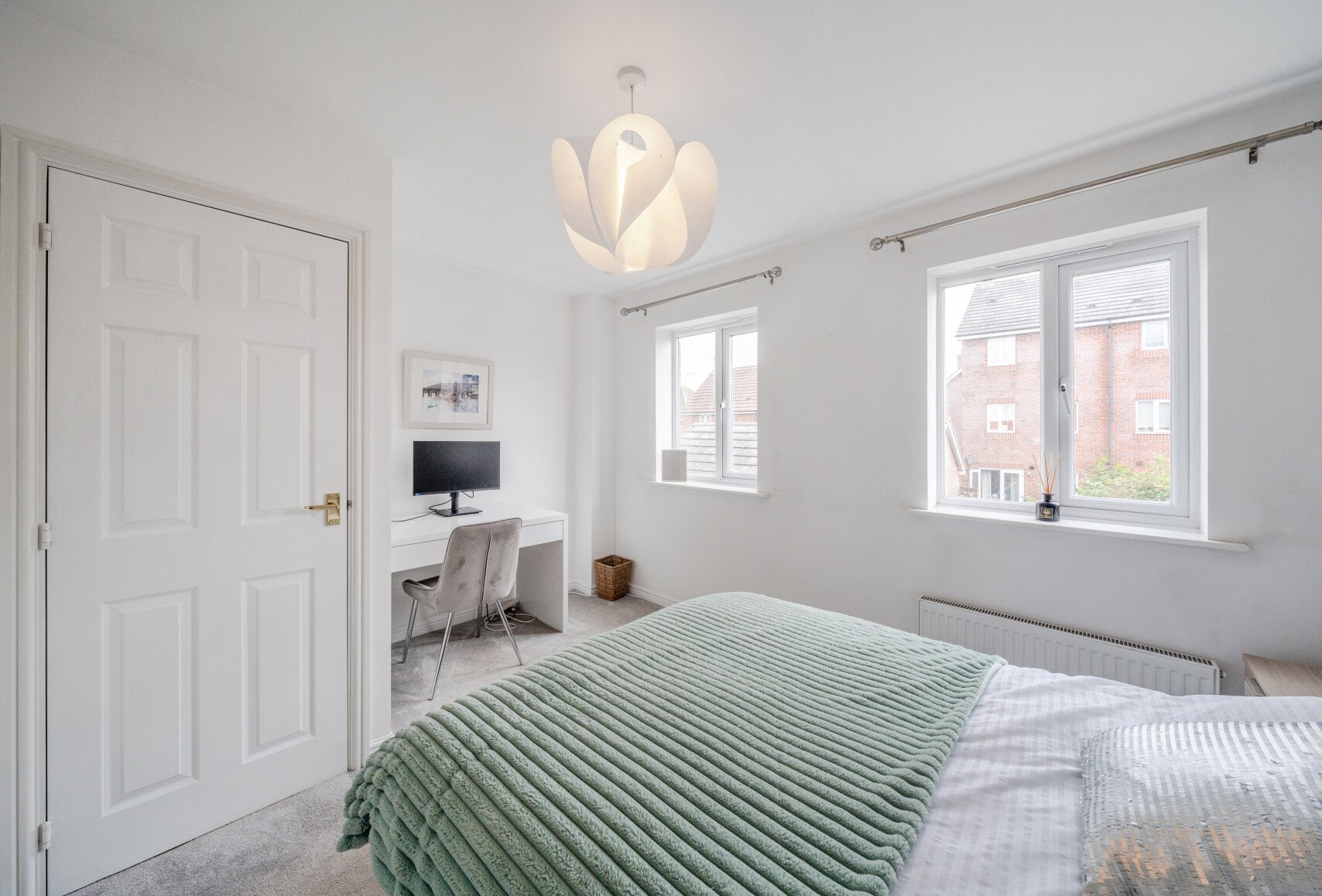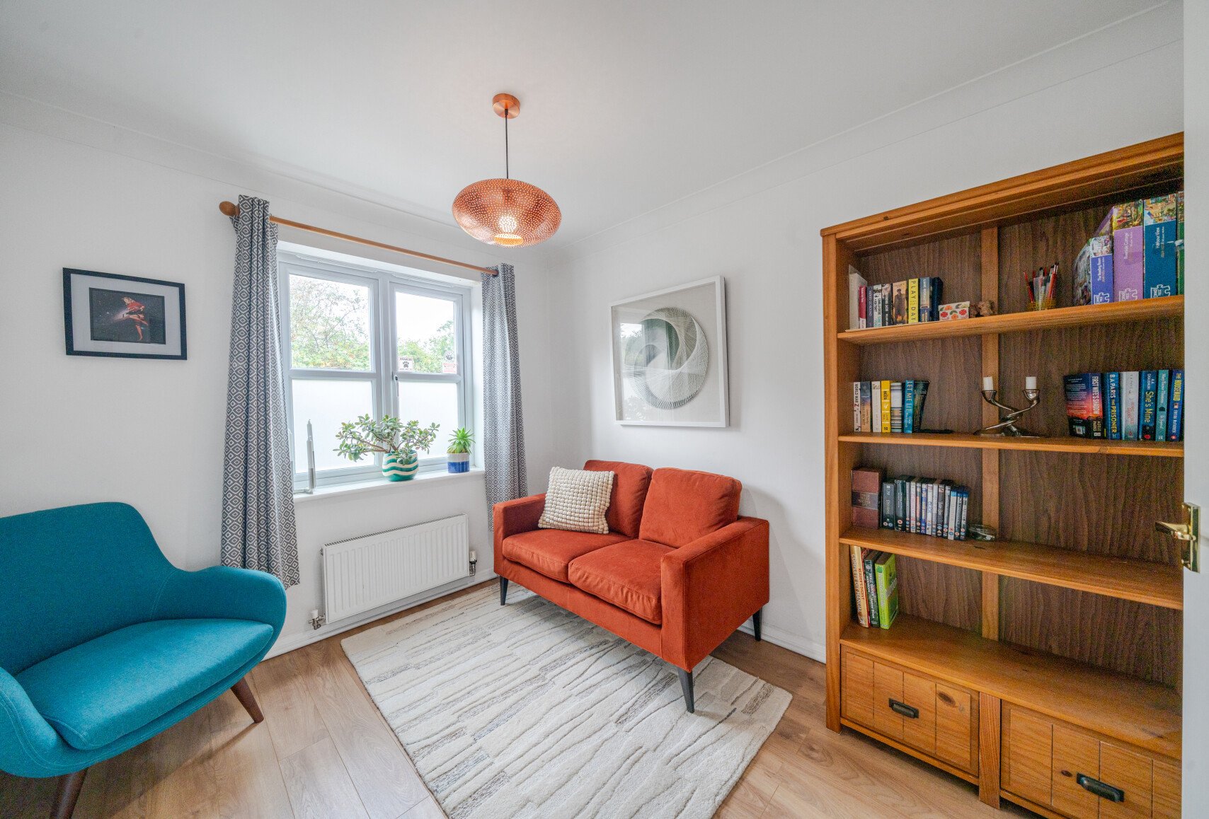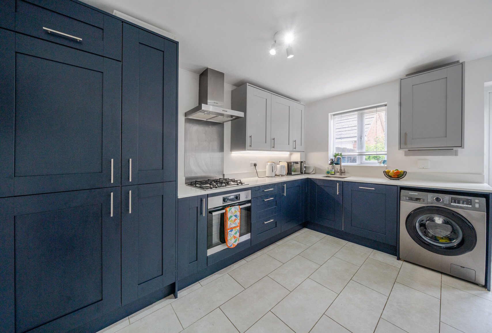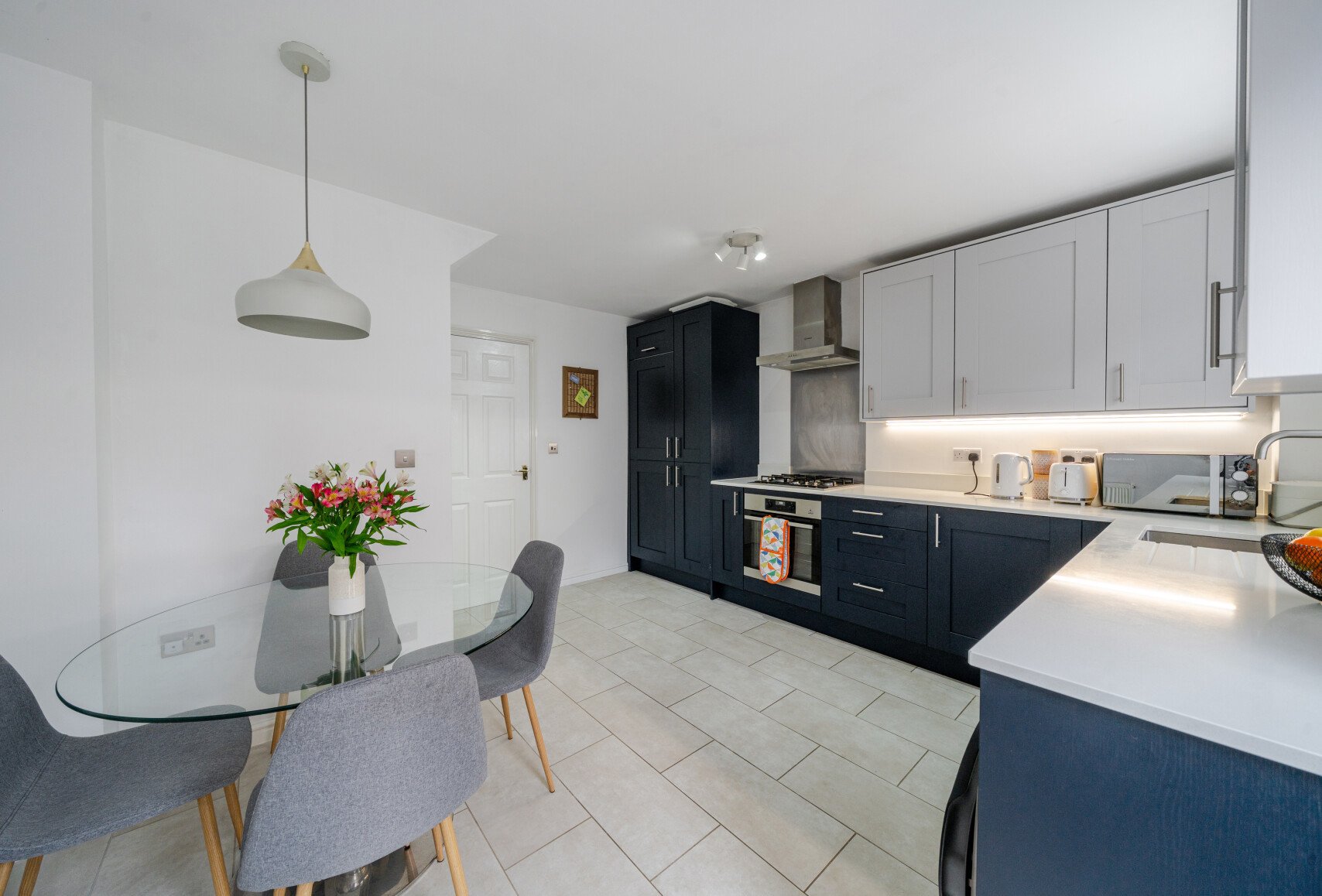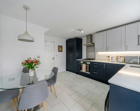 The entrance hall leads to a generously sized downstairs room, which can be used as a fourth bedroom, study, or dining room—demonstrating the flexibility this home offers. The kitchen is located at the rear and features a range of wall, base, and drawer units, a single basin, an integrated dishwasher, and quartz worktops. It provides direct access to the low-maintenance rear garden.