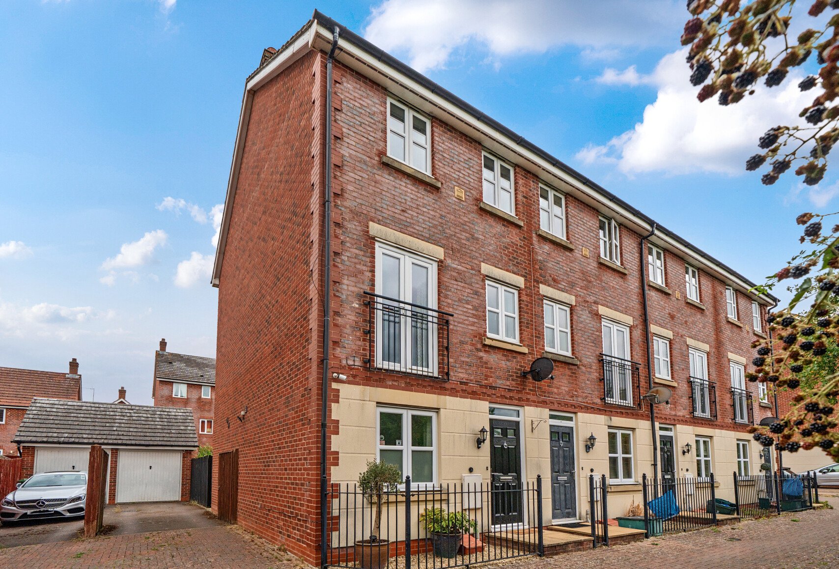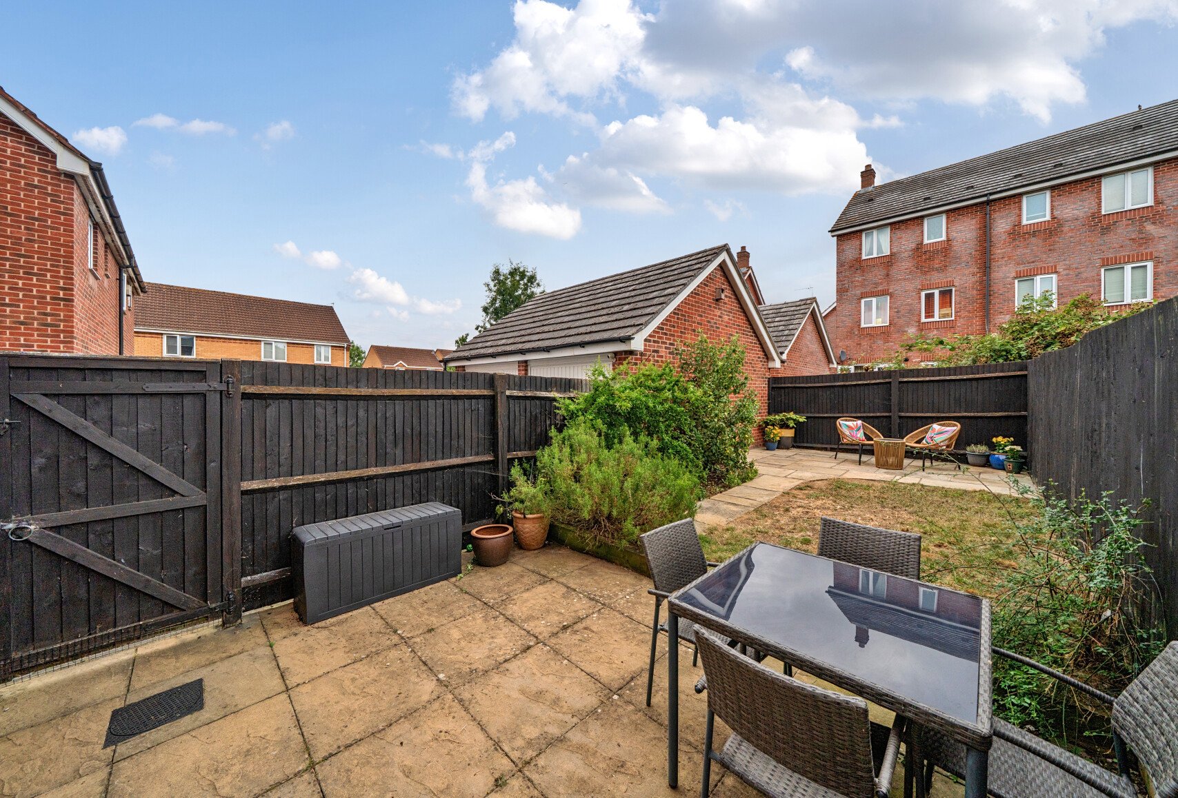 To the side of the property is a driveway with parking for two cars and a single garage with a pitched roof. Gated access leads into the rear garden.