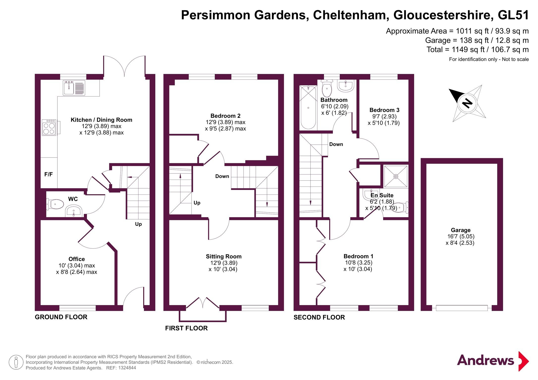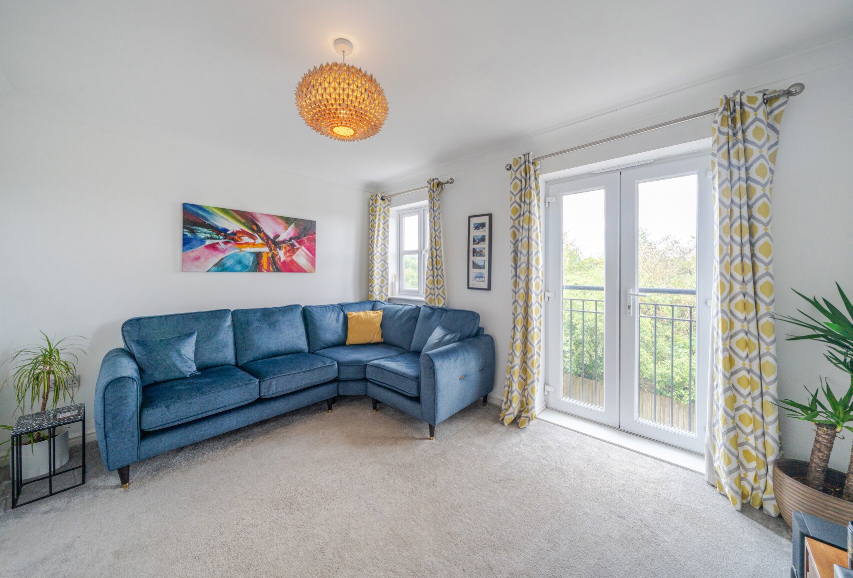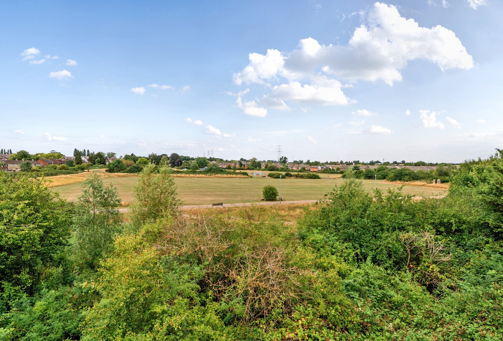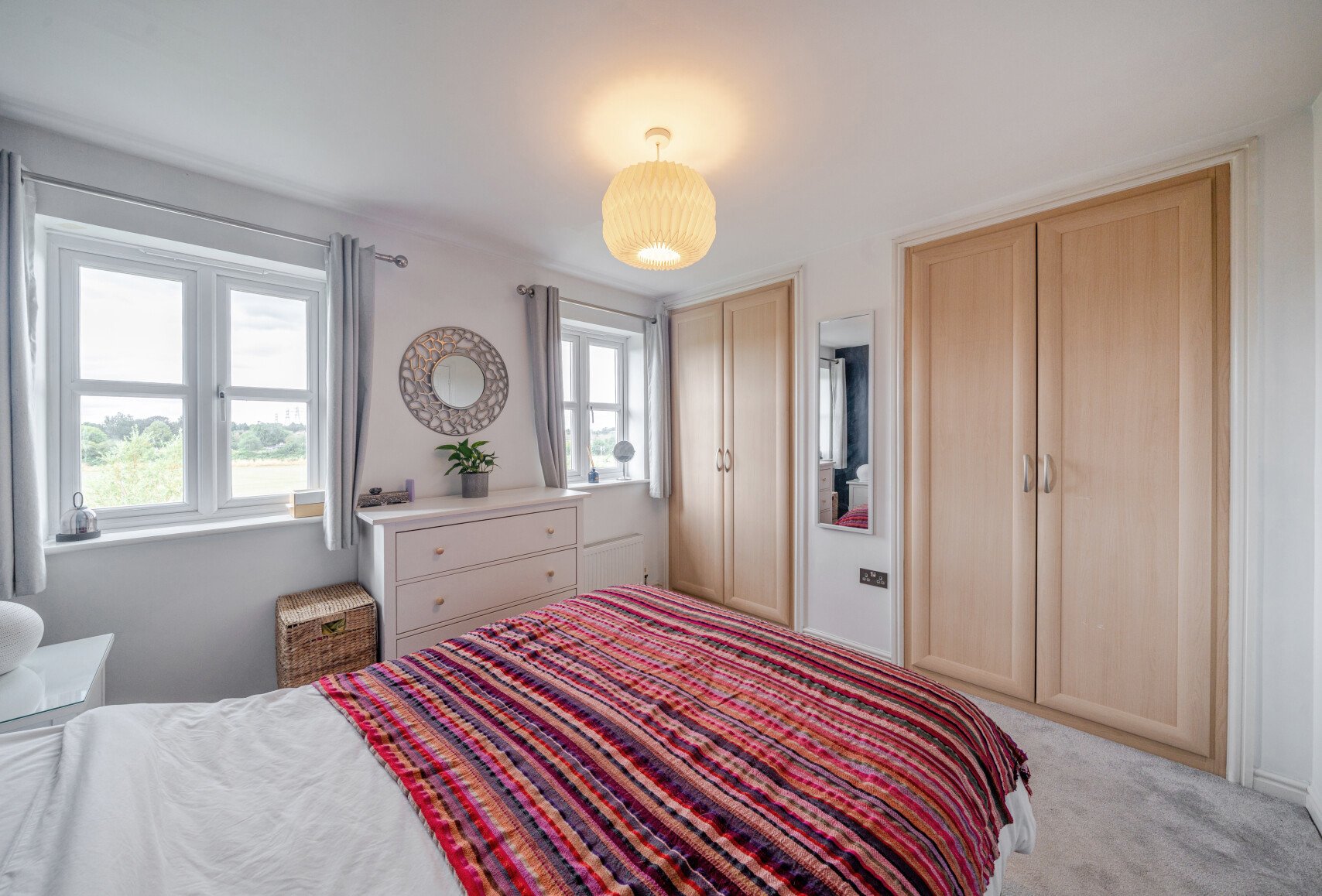 Upstairs, the first floor opens onto a landing. Bedroom two overlooks the rear garden, while the living room features a Juliet balcony that makes the most of the open views to the front. This bedroom also benefits from built-in storage.
