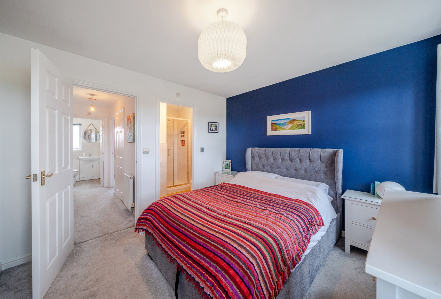 The top floor is home to the primary bedroom, which features a full wall of built-in wardrobes and an en-suite shower room. From this elevated position, you can enjoy wonderful views over the surrounding fields.