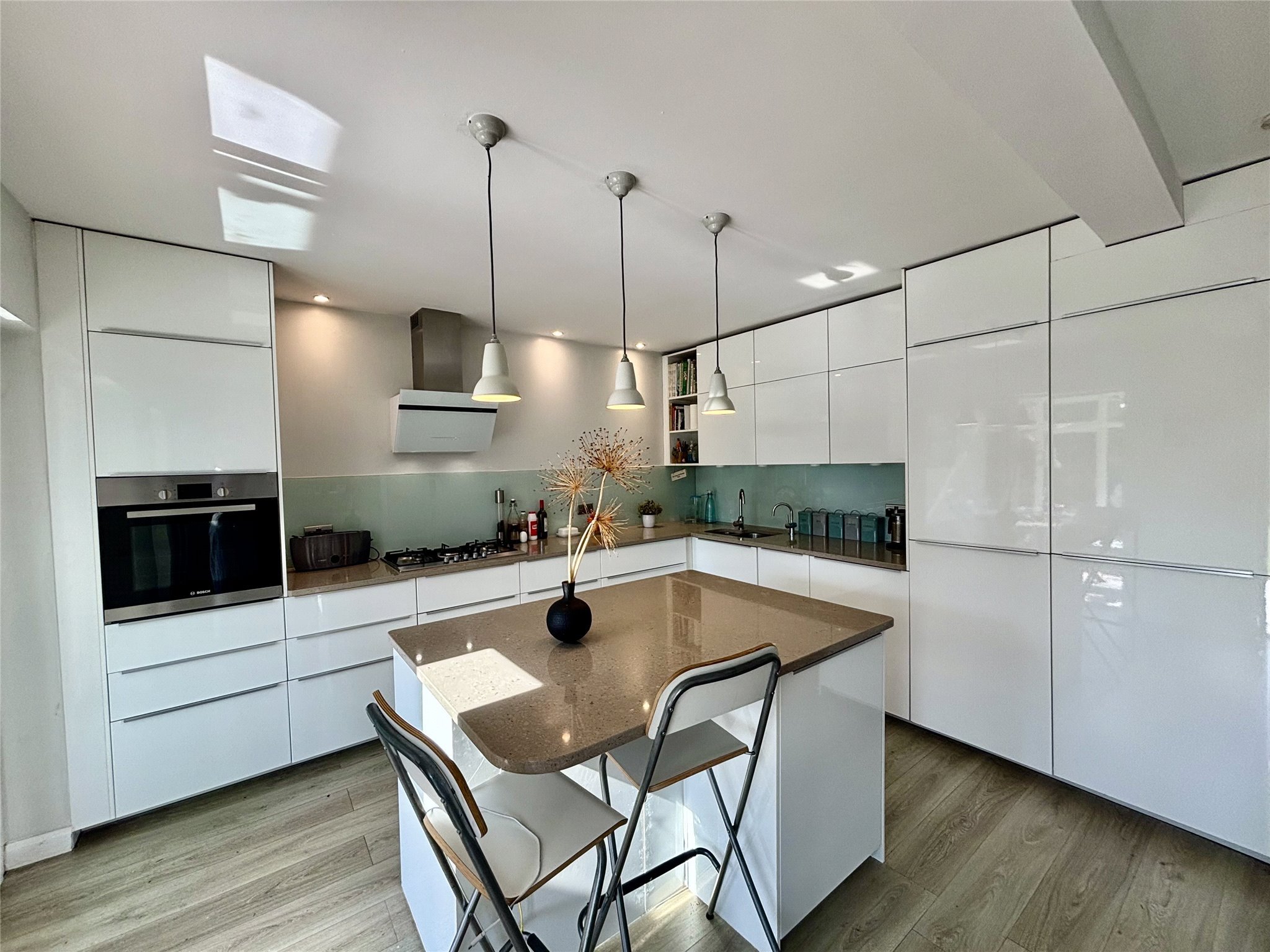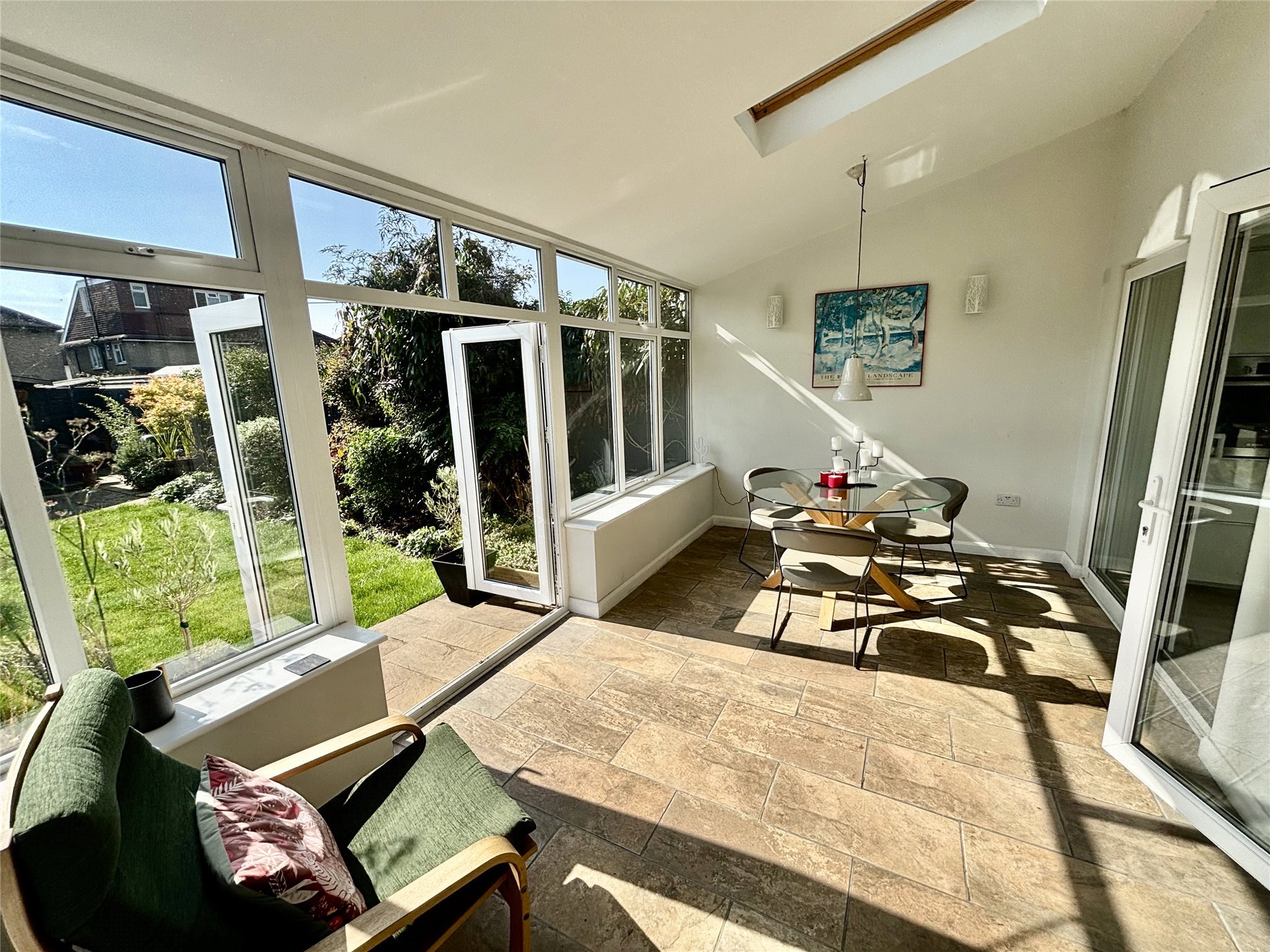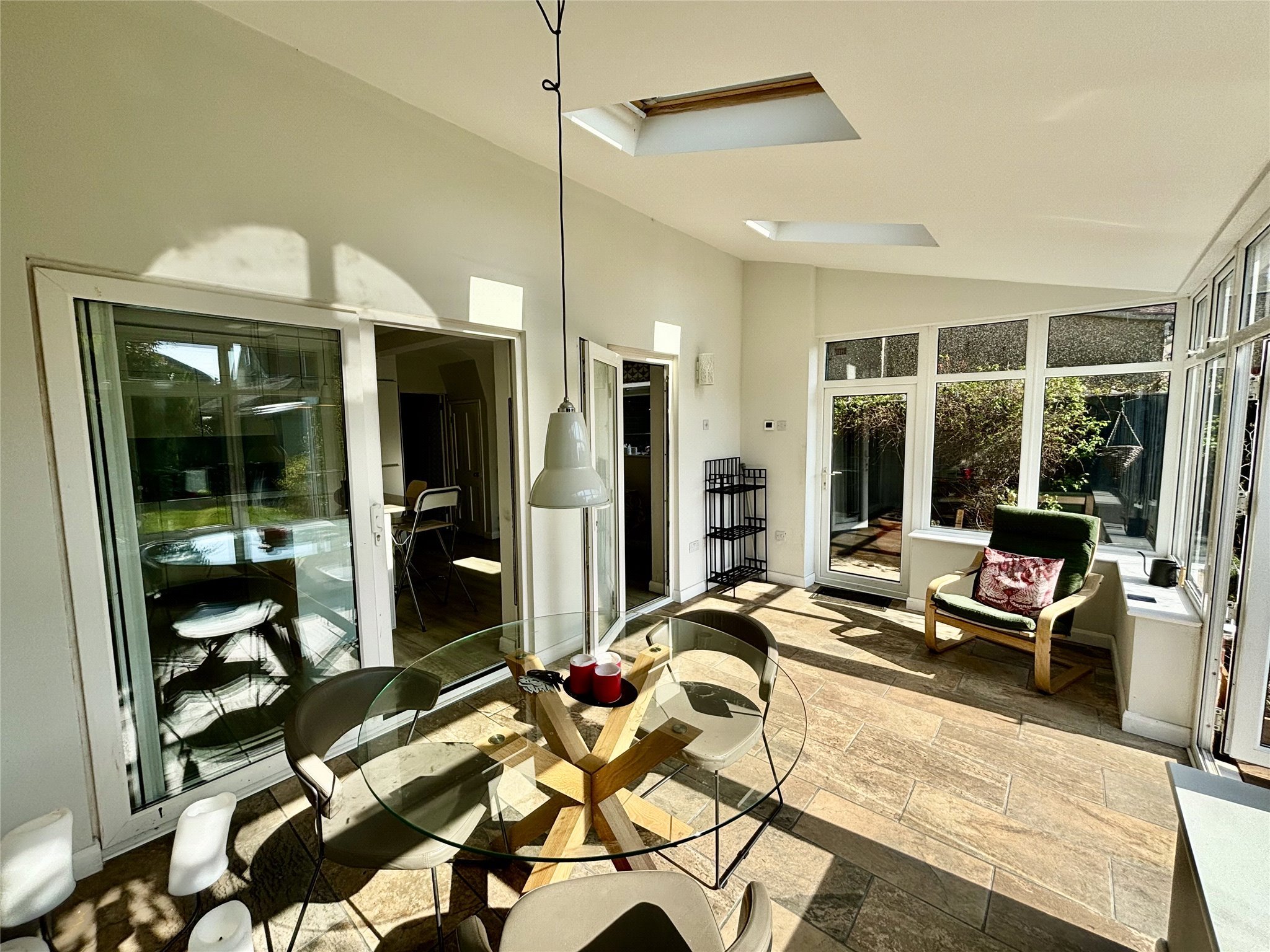 The heart of the home is a stylish kitchen/breakfast room, complete with integrated appliances and a central island — perfect for both everyday living and entertaining. To the front, a welcoming living room provides a cosy retreat, while to the rear, a versatile reception room/sun room opens via patio doors to the garden, creating a seamless indoor-outdoor flow.